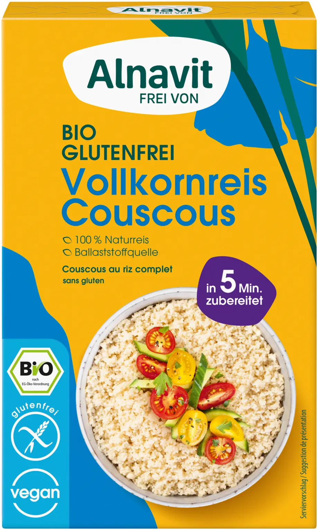 Ovaj bezglutenski couscous od brašna od integralne riže idealna je baza za brza i kreativna jela. Bilo kao topli prilog, hladna salata ili čak slatki doručak s mangom i kokosom – imate svu slobodu! Spreman za samo pet minuta, pruža vam cjelovit, raznolik obrok.