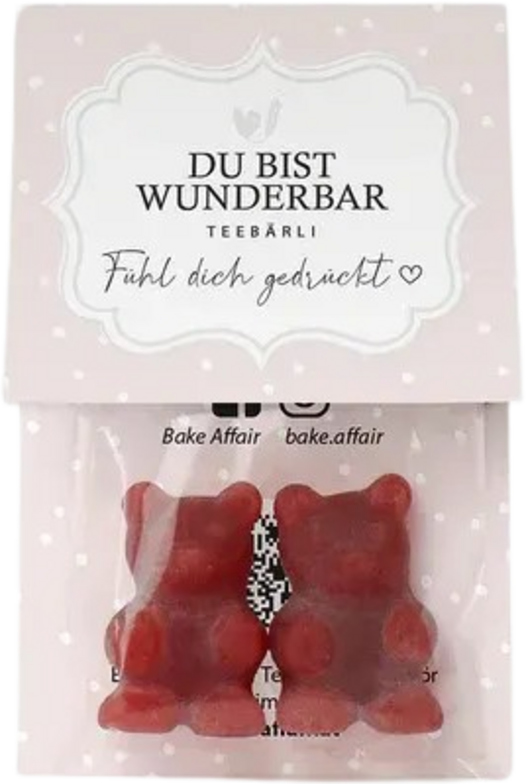 Čajni medvjedići "Du bist wunderbar" (Predivan/Predivna si) brenda Bake Affair su predivan poklon za obitelj i prijatelje. Gumeni medvjedići s okusom jagode u tren oka pretvaraju vruću vodu u neodoljiv voćni čaj.