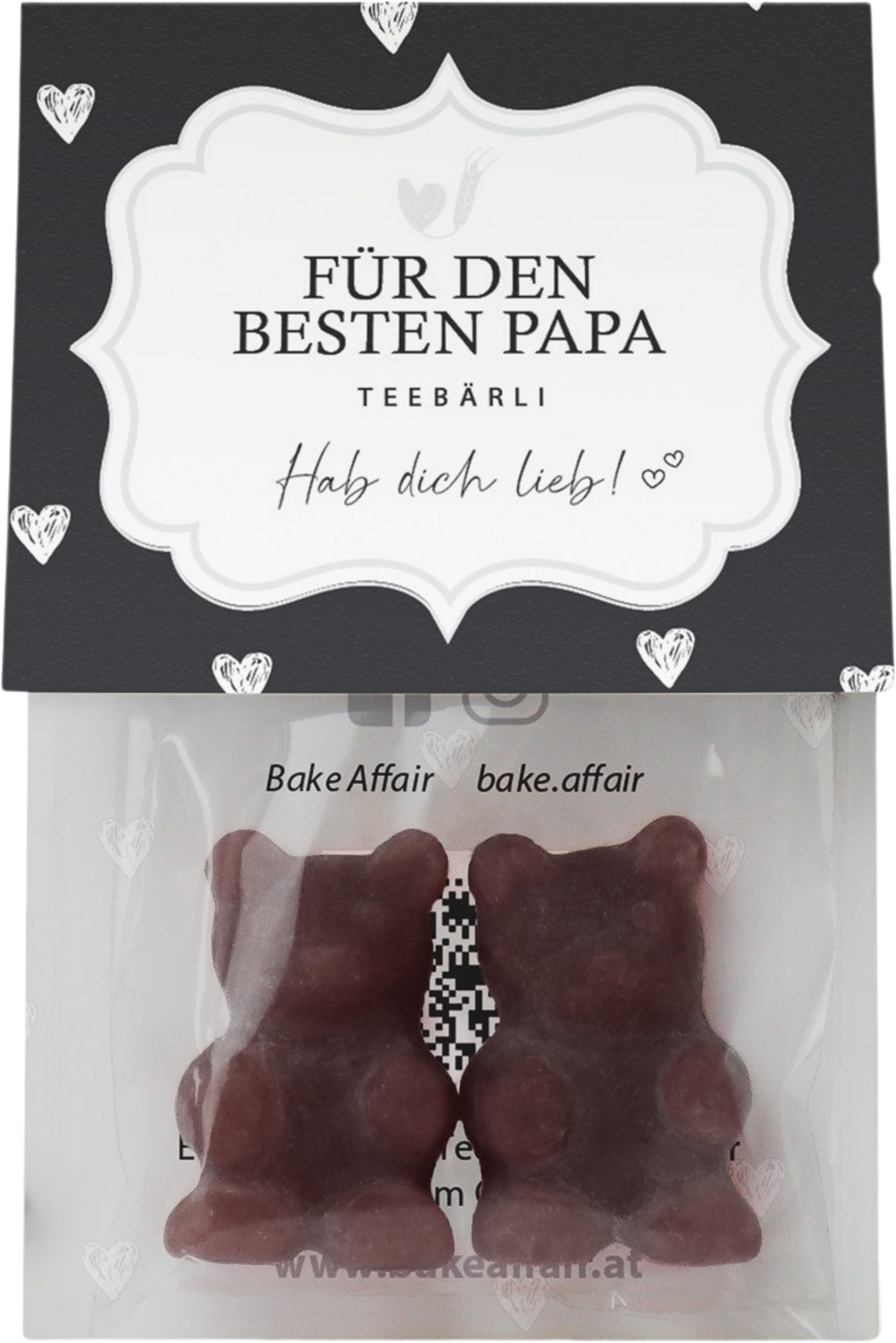 Čajni medvjedići "Für den besten Papa" (Za najboljeg tatu) brenda Bake Affair sigurno će donijeti veliku slatku radost vašem tati. Njihovo pakiranje nosi natpis "Hab dich lieb" (Volim te). Sa svojim okusom cole toplom napitku daju posebnu notu. Naravno, čajni se medvjedići po želji mogu i izravno grickati.
