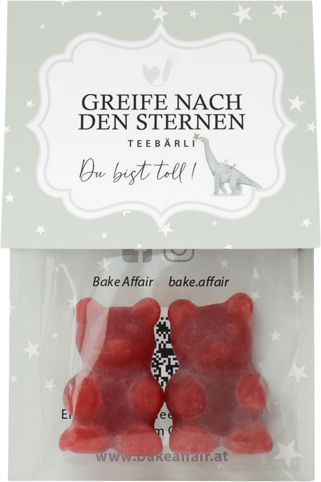 Tražite slatki poklon za svoje najdraže? Uz čajne medvjediće brenda Bake Affair uvijek donosite dobar izbor. Čajni medvjedići "Greife nach den Sternen" (Posegni za zvijezdama) u tren oka postaju aromatičan voćni čaj s okusom jagode te su zbog toga zajamčeno ukusni malim i velikim obožavateljima ovog popularnog toplog napitka. Uz to je na pakiranju i natpis "Du bist toll!" (Super si!).