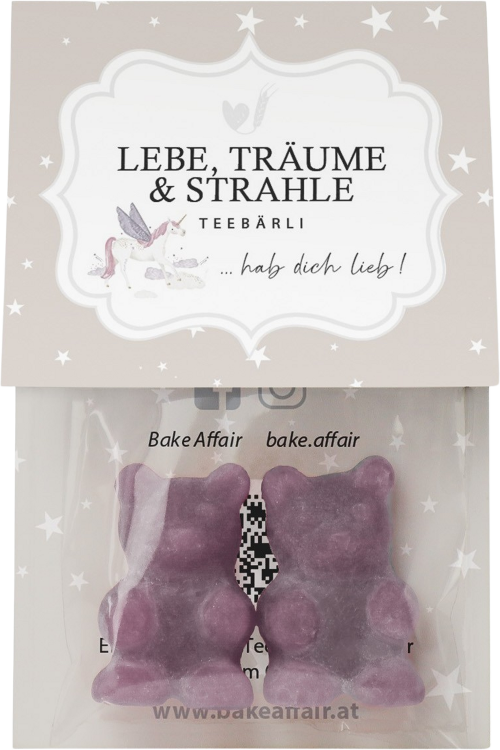 Ovi posebni čajni medvjedići brenda Bake Affair svojim okusom jogurta i borovnice oduševit će i mlade i stare. Čajni medvjedići "Lebe, Träume & Strahle" (Živi, sanjaj i blistaj) savršeni su kao poklon dragim osobama. Pakiranje dodatno nosi natpis "hab dich lieb" (volim te).