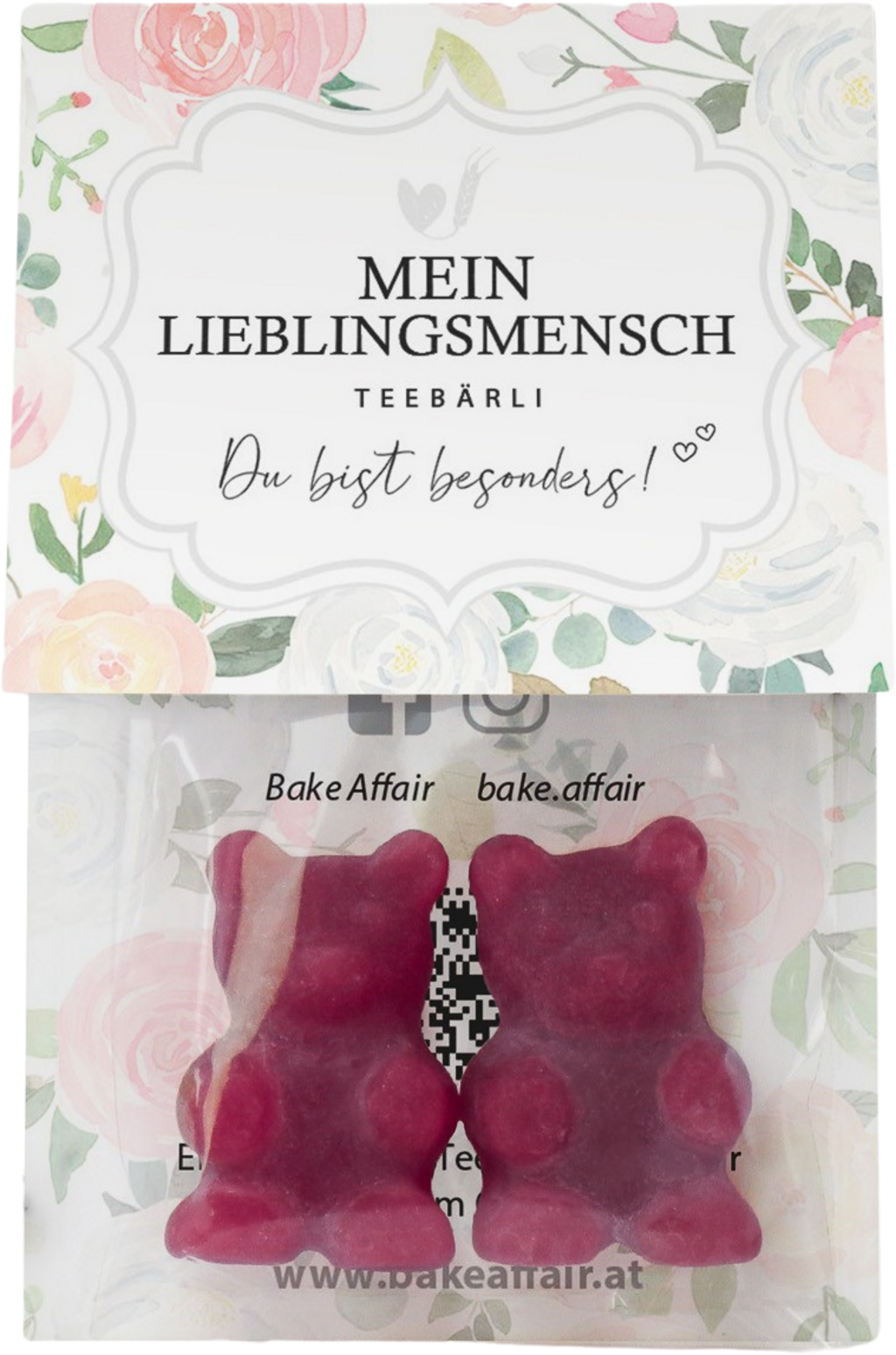 Uljepšajte svakodnevicu svojoj najdražoj osobi. Uz čajne medvjediće "Mein Lieblingsmensch" (Moja najdraža osoba) brenda Bake Affair uvelike ćete razveseliti svoje najdraže. Čajni medvjedići imaju okus bazge i rabarbare i dovoljni su za 1 - 2 topla napitka ili se mogu jednostavno izravno grickati. Pakiranje dodatno nosi natpis "Du bist besonders" (Poseban/posebna si).