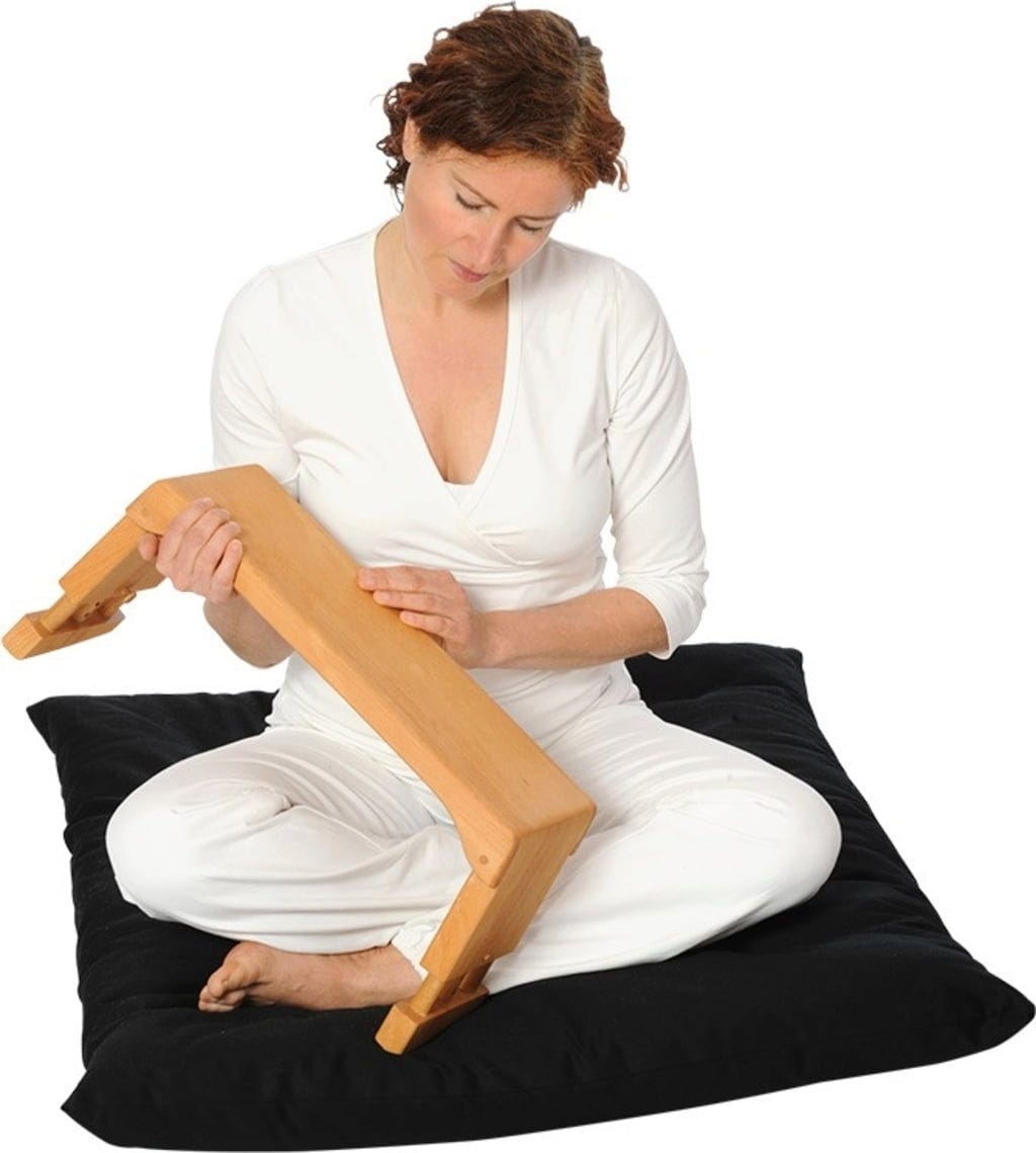 Meditacijska stolica izrađena od masivnog bukovog drva ima nosivost do 125 kg. Idealna je za sjedenje na koljenima/petama. Sjedalo je lagano nagnuto prema naprijed, tako da je zdjelica lagano nagnuta prema naprijed, što omogućuje osobi da sjedi ravno i uspravno tijekom meditacije.