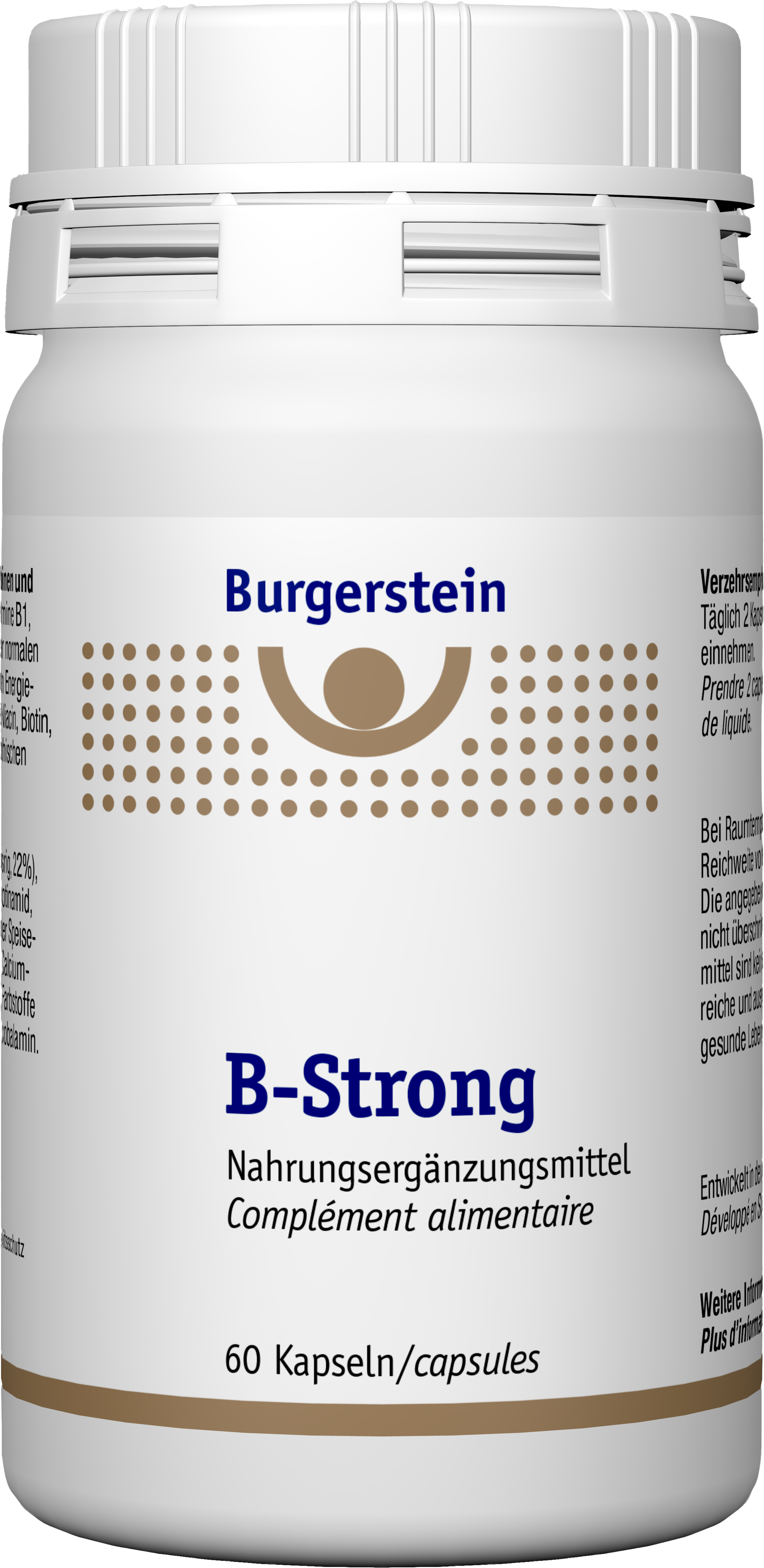Ovaj proizvod tvrtke Burgerstein kombinira osam vitamina B skupine, uključujući vitamine B1, B2, B6 i B12. Vitamin B6 doprinosi normalnoj funkciji živčanog sustava, dok vitamin B12 doprinosi normalnoj funkciji imunološkog sustava. Proizvod je dodatno obogaćen magnezijem, folnom kiselinom, ašvagandom i drugim sastojcima. Ašvaganda je biljka s dugom poviješću u indijskoj tradiciji.