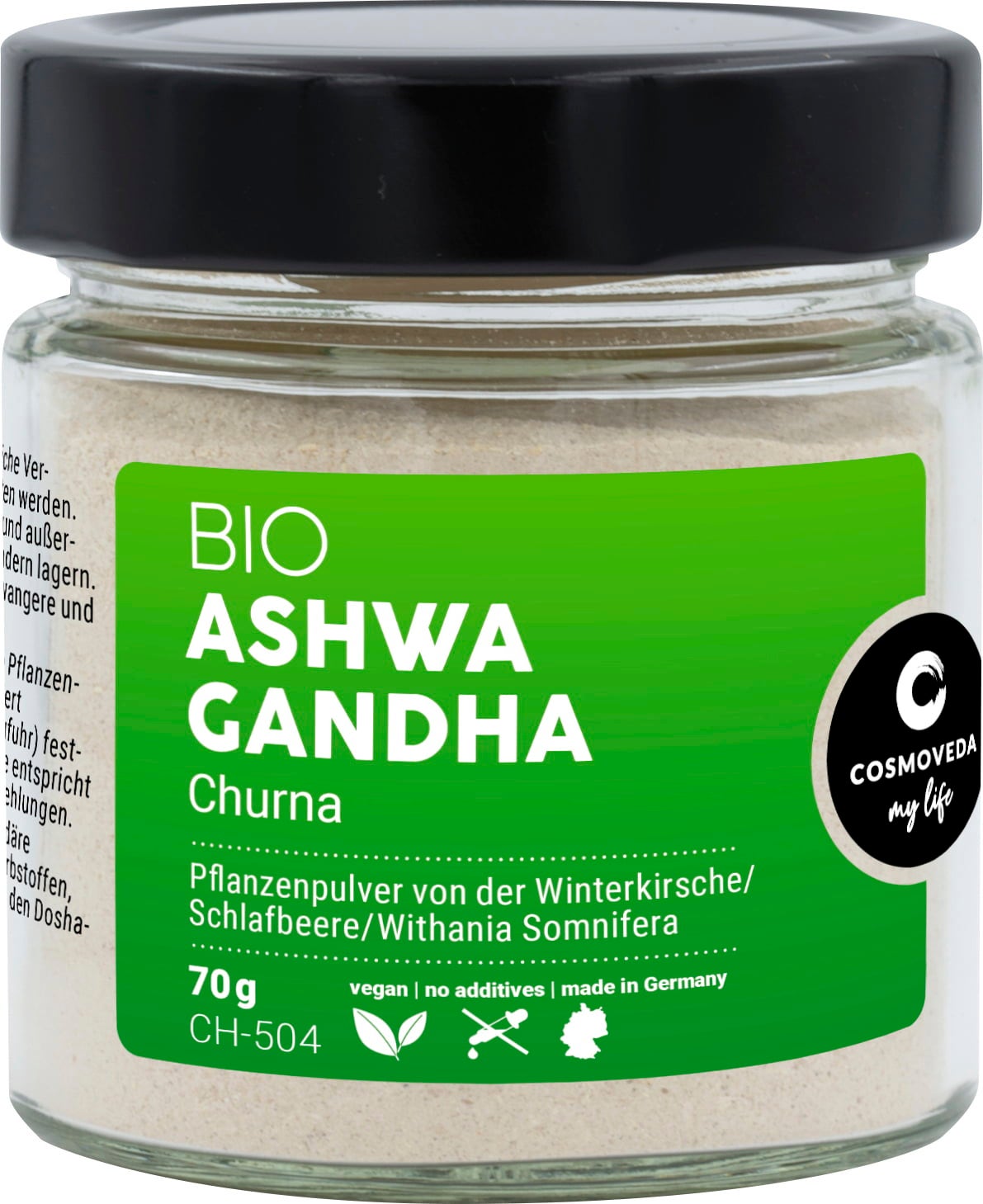 Ashwagandha - Whitania somnifera - je zimzelena, grmolika biljka visoka 0,5-1,5 m s mesnatim korijenom, jednostavnim, zelenim, ovalnim listovima i sitnim, sfernim, narančastocrvenim bobicama, čiji se korijen koristi u ajurvedskoj prehrani. Fino i nježno (ispod 40°C) mljeveni prah osušenog korijena dolazi iz indijskih i šrilankanskih COSMOVEDA fair trade i ekoloških projekata.