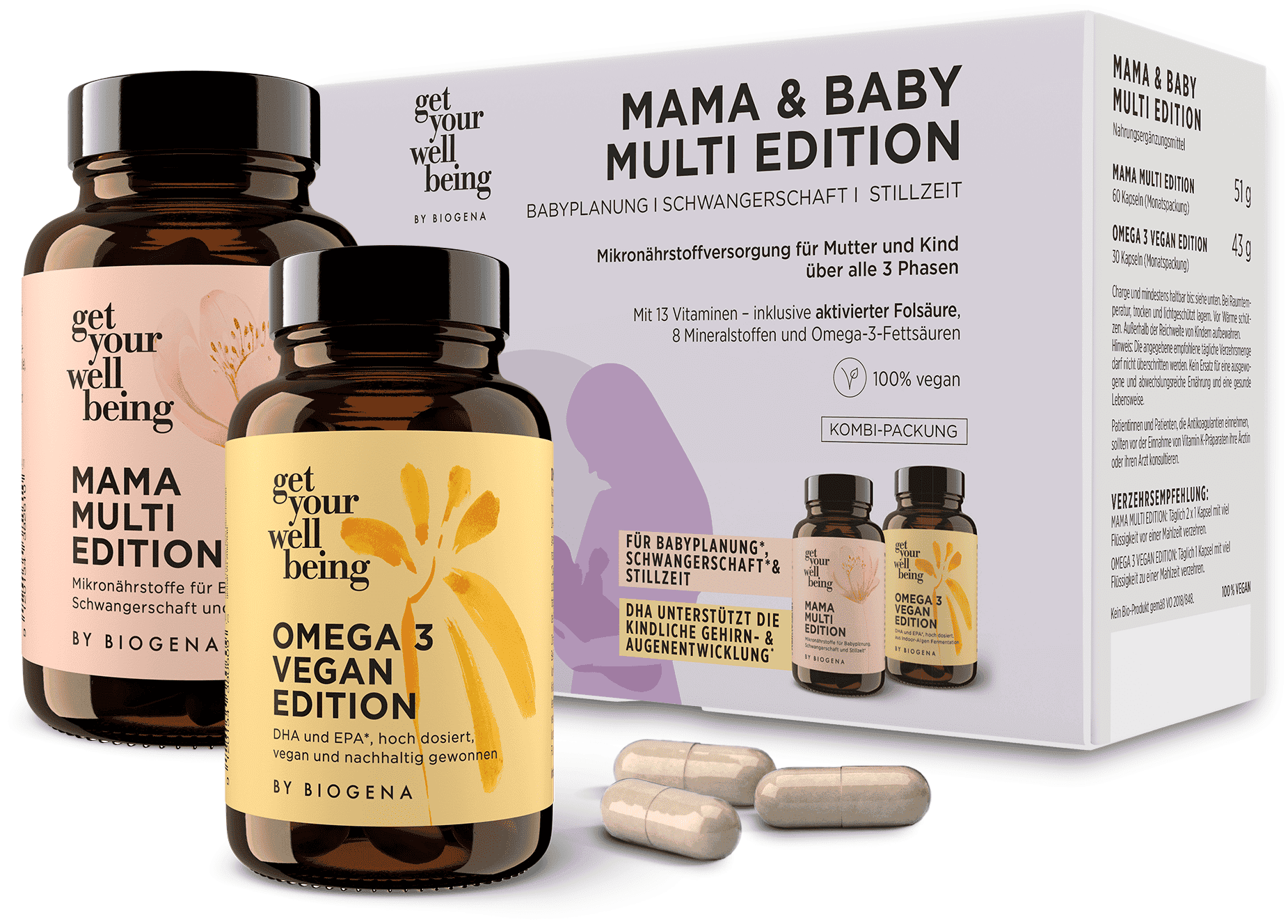 Ovaj paket spaja Mama Multi Edition i Omega 3 Vegan Edition. Pažljivo odabrani multivitamini susreću se s čistom omega-3 masnom kiselinom iz održivog ulja algi. Nudi uravnoteženu kombinaciju važnih vitamina, minerala i dragocjenih masnih kiselina – prilagođeno posebnim prehrambenim potrebama u osjetljivim životnim fazama. Svi su proizvodi 100 % veganski, bez bojila, bez glutena i laktoze, te bez konzervansa u skladu sa zakonskim propisima.