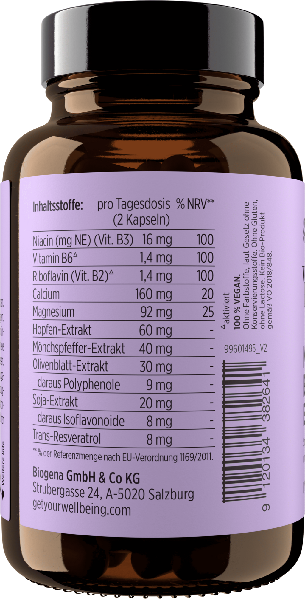 MENO BALANCE EDITION objedinjuje pažljivo usklađen odabir biljnih ekstrakata poput konopljike, hmelja, lista masline i soje s trans-resveratrolom. Recepturu nadopunjuju vitamini B2, B3 i B6, kao i minerali kalcij i magnezij.