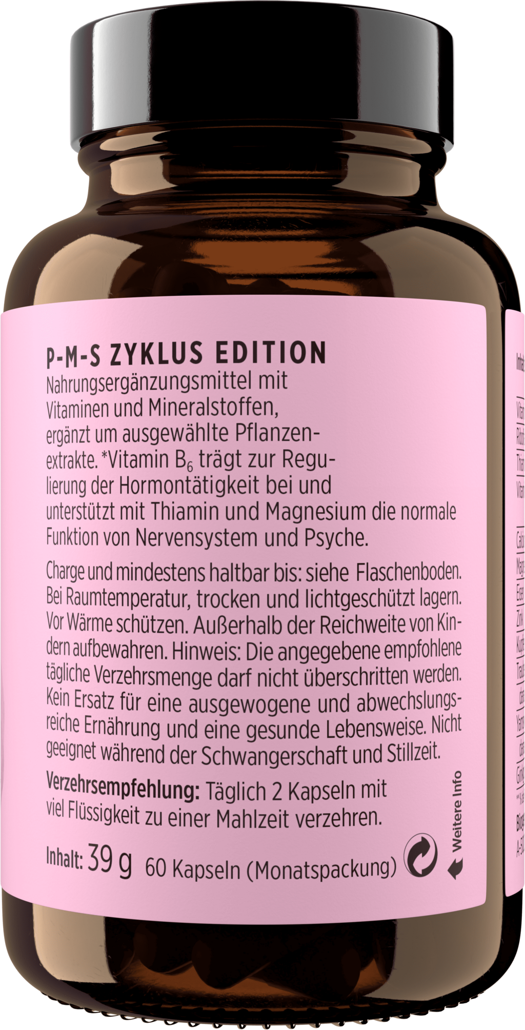P-M-S CIKLUS EDITION nudi ciljanu kombinaciju za žene koja se sastoji od vitamina B1, B2, B6 i vitamina D, te minerala magnezija u mješavini od četiri soli, kalcija, željeza iz dva izvora, cinka i bakra, kao i biljnih ekstrakata (korijen yama, ginko, sjemenke grožđa).