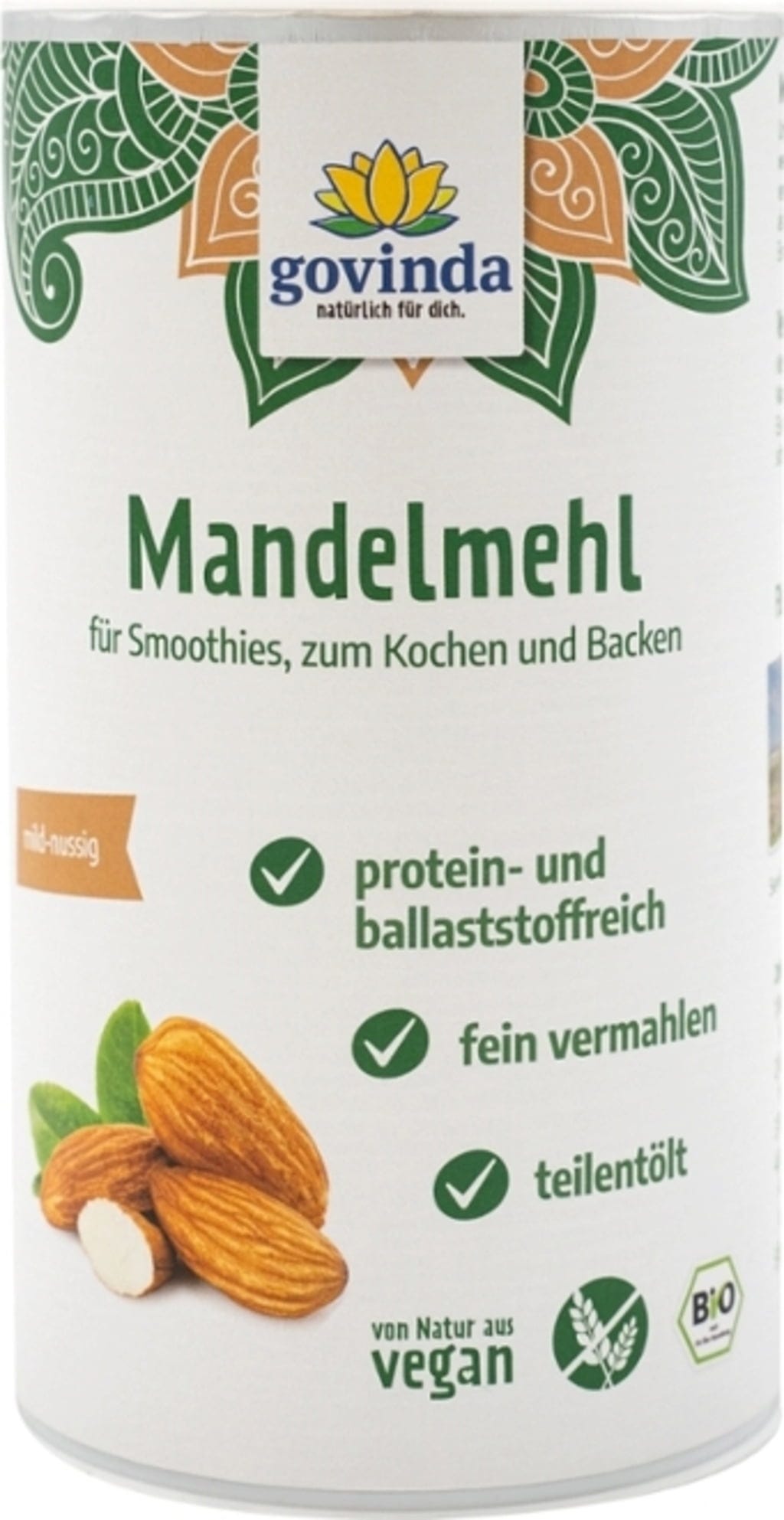 Bademovo brašno Bio dobiva se iz zrelih plodova bademovog drveta hladnim prešanjem. Prešani kolač (osnova bademovog brašna) sada je djelomično odmašćen i fino samljeven. Samo se odabrani slatki bademi koriste za proizvodnju organskog brašna od badema Govinda.