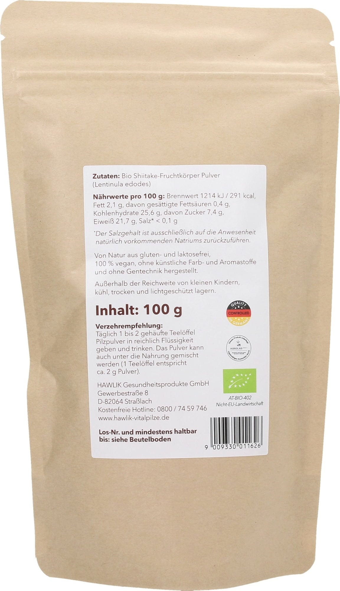 Ovaj prah sastoji se od prirodne gljive Shiitake, koja se naziva i Lentinula edodes. Za proizvodnju se plodište nježno suši i fino melje. Brojne hranjive tvari, poput polisaharida, kalcija, fosfora, željeza, cinka te ergosterola i sedam esencijalnih aminokiselina, pritom ostaju sačuvane. Prirodno, vegansko i bez umjetnih boja i aroma.