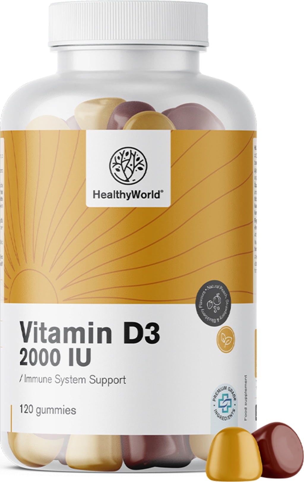 Ovi HealthyWorld gumeni bomboni pružaju visoku dozu vitamina D3. Vitamin D doprinosi održavanju zdravlja kostiju. Gumeni bomboni su izvrsna alternativa kapsulama i tabletama jer se lako uzimaju. Dolaze u ukusnim okusima jagode, breskve i kupine te ne sadrže gluten.