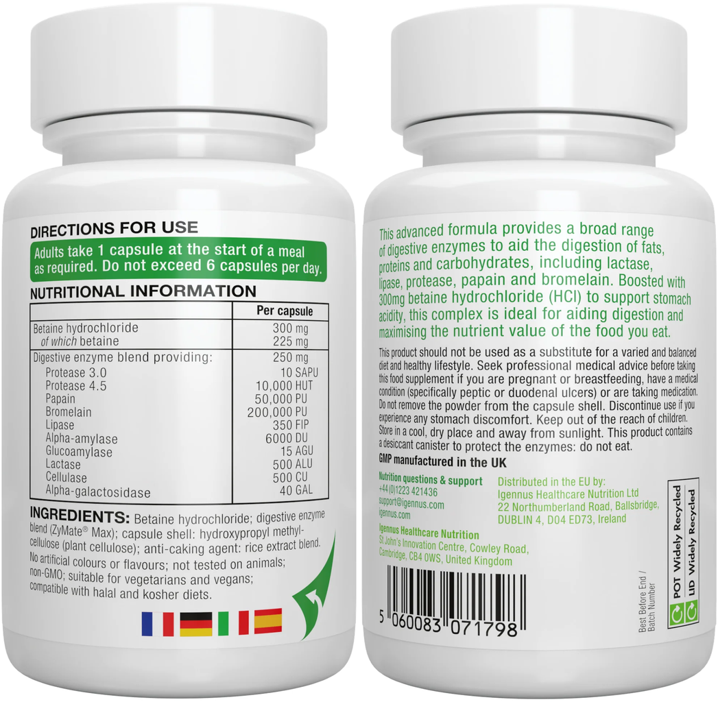Betain-HCl, ZyMate® Max (mješavina probavnih enzima), biljna ovojnica kapsule (hidroksipropilmetilceluloza), Release Agent (Mješavina ekstrakta riže)