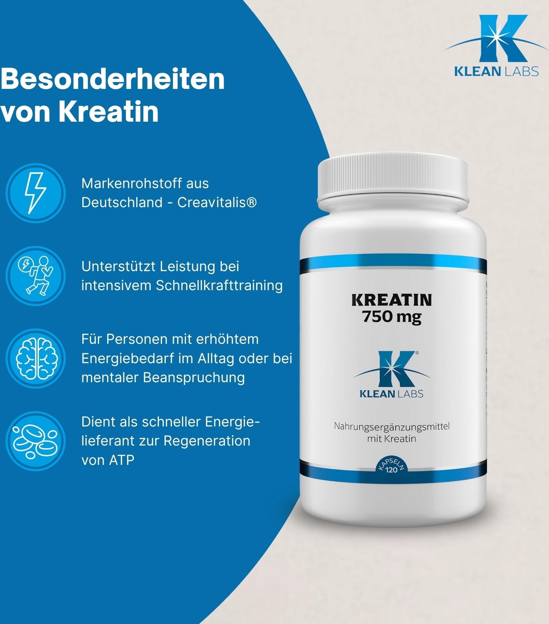 KLEAN LABS Kreatin kapsule Creavitalis®, 120 kaps.