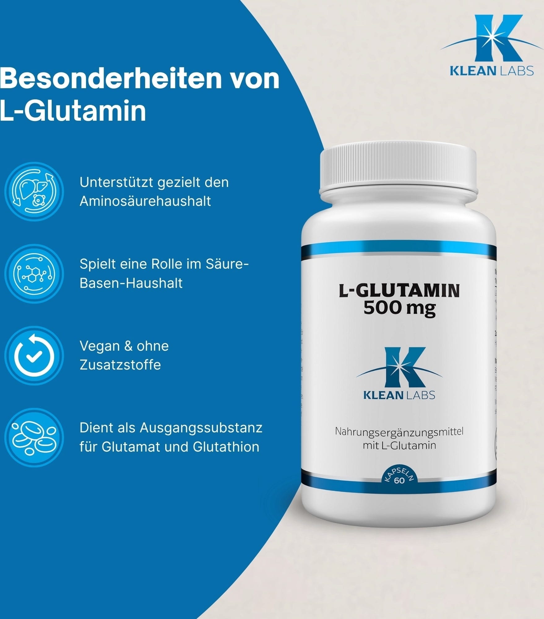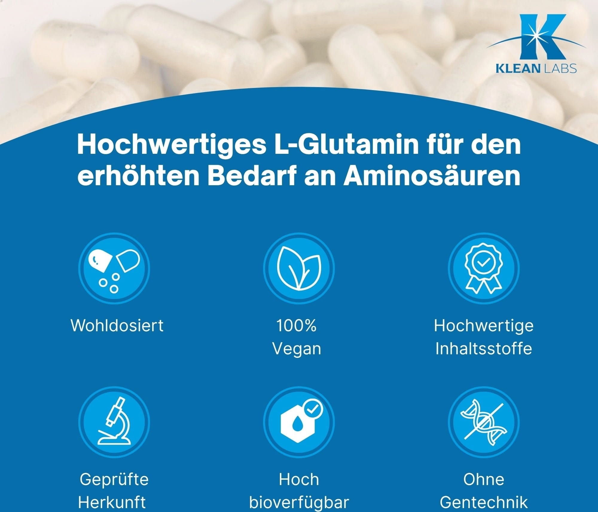 L-glutamin se ovdje koristi kao čista aminokiselina i prirodni je antioksidans. Klean Labs kapsule su 100% veganske i nisu GMO.