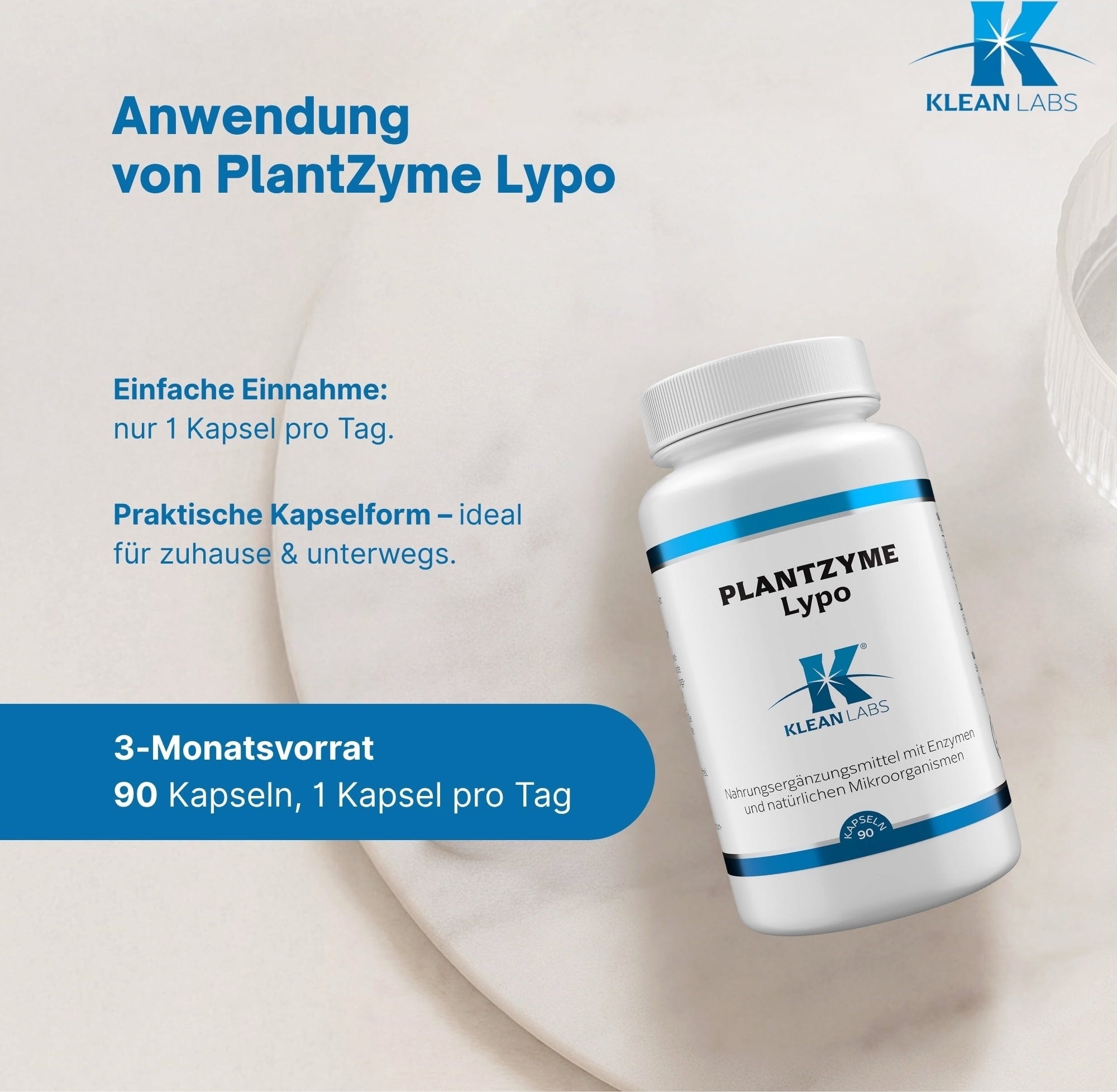 PlantZyme Lypo marke KLEAN LABS je ciljana enzimska formula s biljnom lipazom, proteazom i Bacillus subtilis. Ova kombinacija je posebno prikladna za obroke s većim udjelom masti ili proteina. Kapsule su pH-stabilne, veganske i bez umjetnih dodataka.