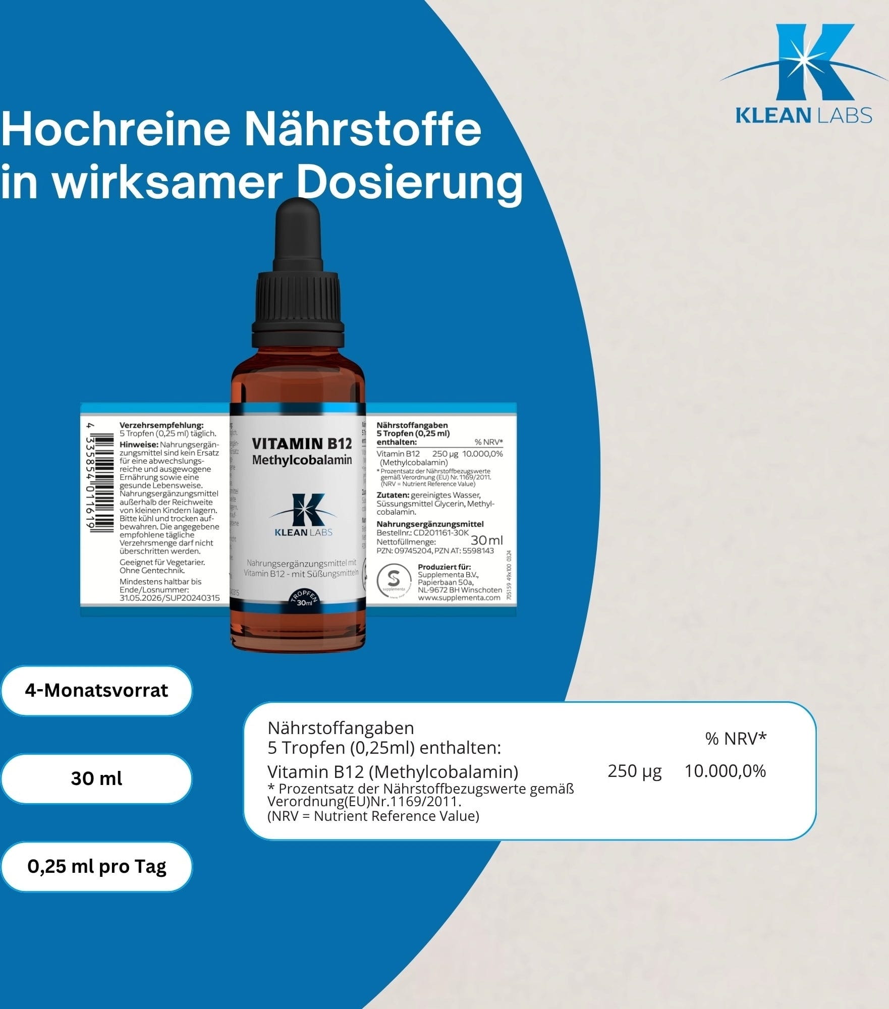 Ove kapi iz Klean Labsa osiguravaju vitamin B12 u visokokvalitetnom obliku metilkobalamina. Tekuća formulacija na bazi glicerina i pročišćene vode omogućuje precizno doziranje i jednostavnu konzumaciju bez potrebe za gutanjem kapsula. Formula je namjerno minimalistička i potpuno bez alkohola, umjetnih aroma i boja. Budući da proizvod ne sadrži životinjske sastojke, gluten i laktozu, zadovoljava najviše standarde za svjesnu prehranu. Bočica osigurava higijensko skladištenje i dugotrajnu zaštitu kvalitete sastojaka.