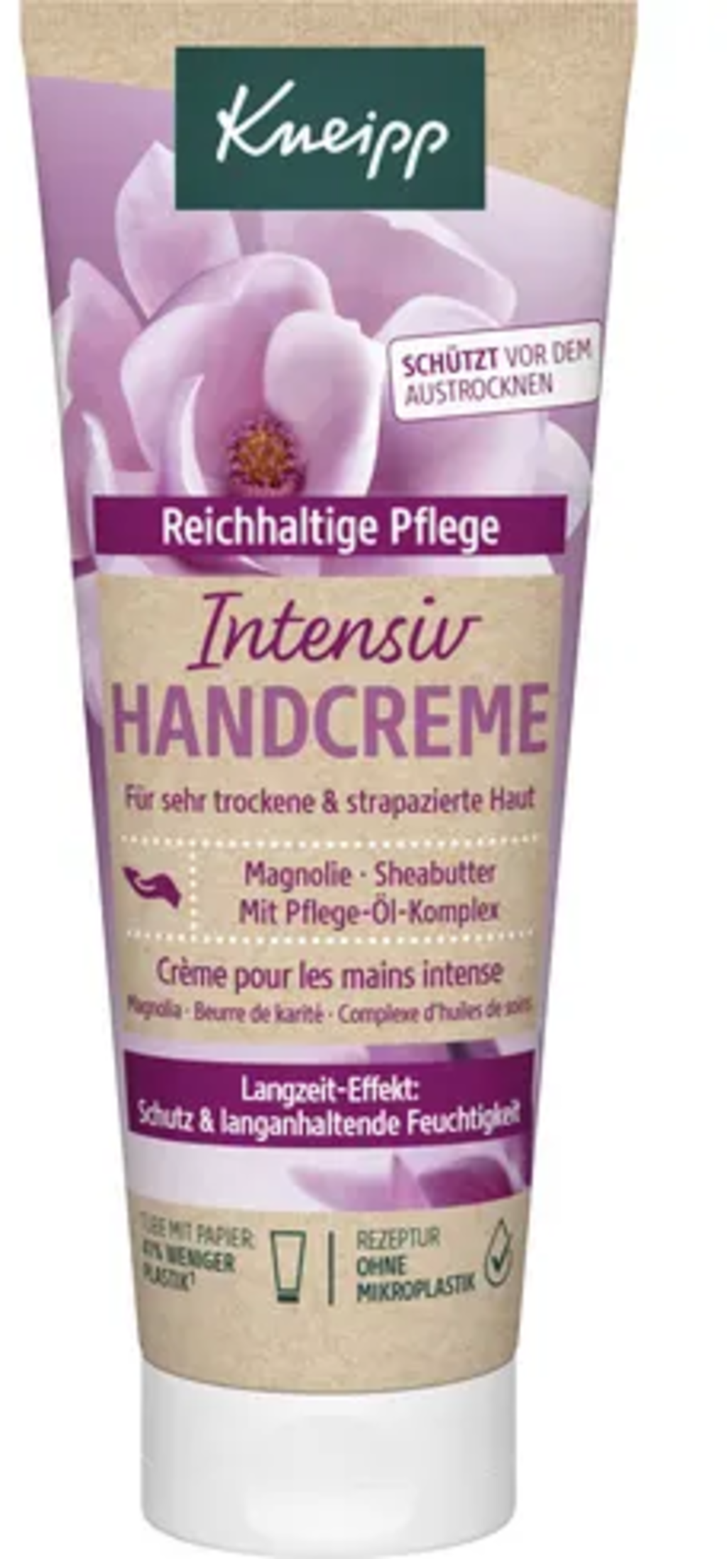 Razmazite svoje preopterećene ruke Kneipp intenzivnom kremom za ruke San od cvijeća. Bogata formula s ekstraktom magnolije te njegujućim uljnim kompleksom od karite maslaca, bademovog ulja i pantenola brzo se upija i pruža dugotrajnu hidrataciju.