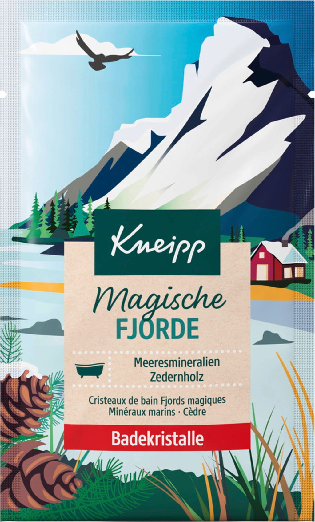 Uz Kneipp kristale za kupku Čarobni fjordovi odlazite u veličanstvena prostranstva nordijskih fjordova. Pri punjenju kade voda poprima blistavu plavo-zelenu boju te vas poziva da na trenutak isključite misli i prepustite se maštanju. Kombinacija morskih minerala i eteričnog ulja cedrovine stvara ugodno jasan mirisni profil koji podsjeća na svježi morski zrak. Ovi kristali za kupku vaš su mali odmor prepun osjećaja prirode. Formulacija je veganska. Sadržaj jednog pakiranja dovoljan je za jednu punu kupku.