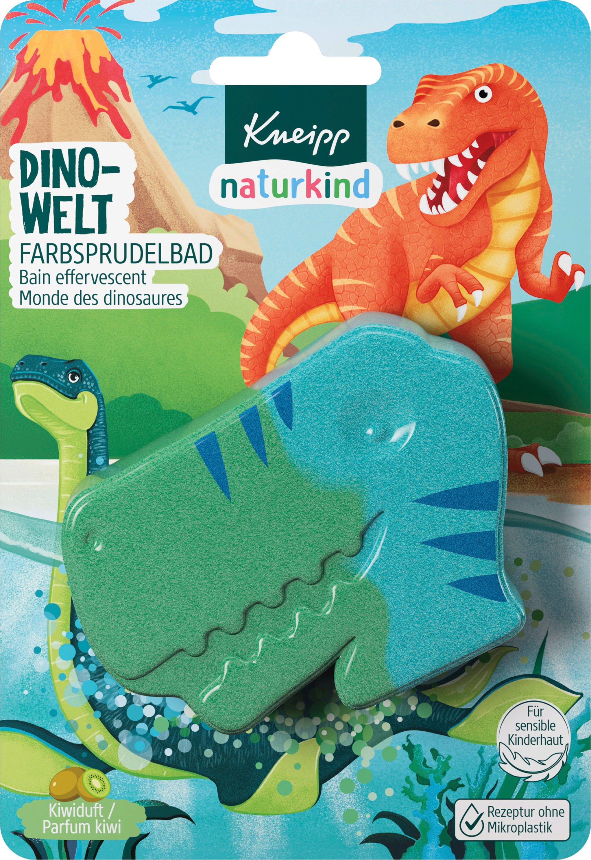 Ova Kneippova šumeća kupka u boji odvodi vaše dijete na uzbudljivo putovanje u svijet dinosaura. Kugla za kupanje počinje šumjeti čim se uroni u toplu vodu, osiguravajući pritom šarenu zabavu tijekom kupanja. Vodi daje živopisnu tirkiznu boju te oslobađa voćni miris kivija.