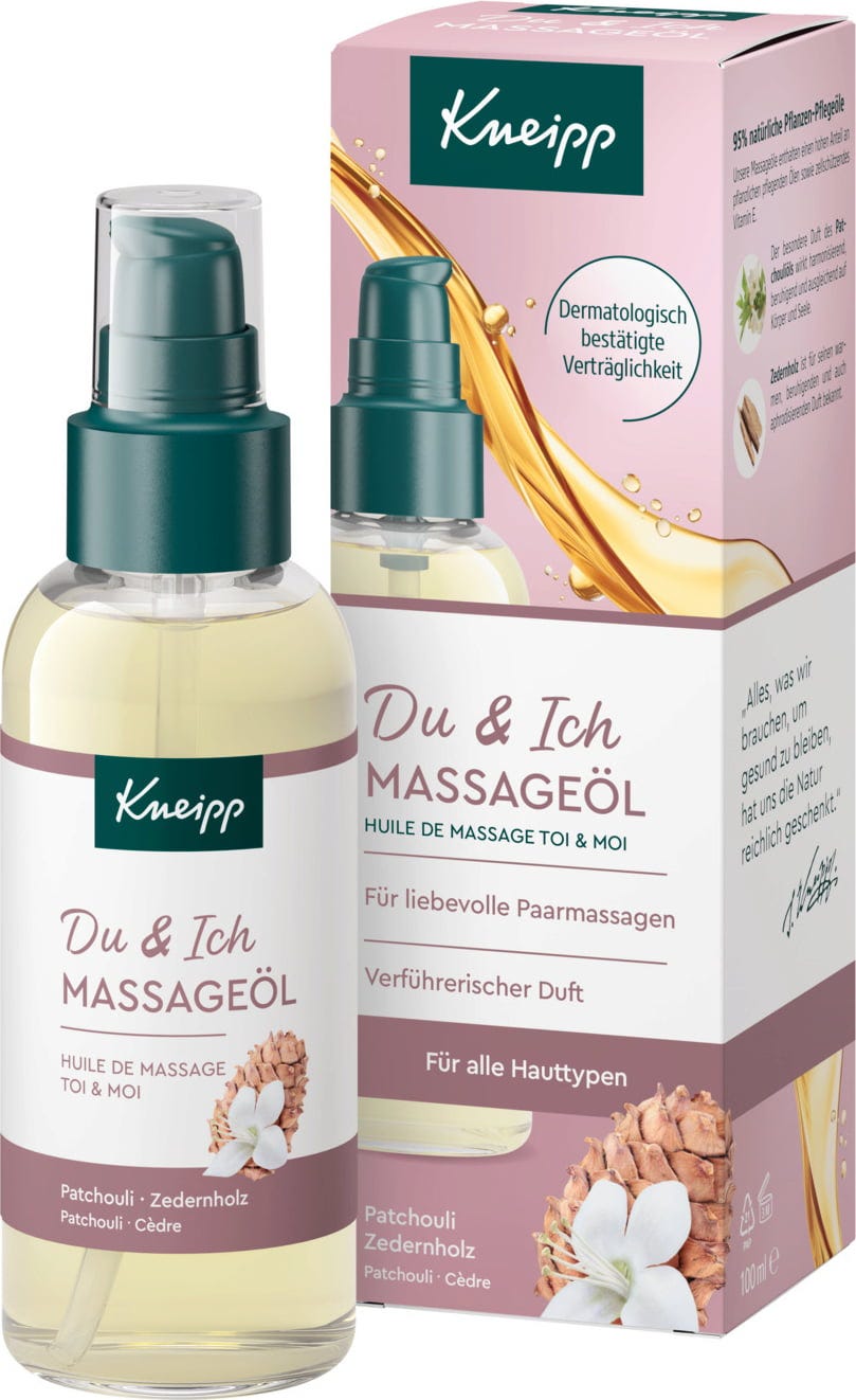 Kneipp ulje za masažu - Ti i ja sadrži hranjiva biljna ulja i prirodna eterična ulja cedra i pačulija. Polako se upija u kožu, omogućujući posebno ugodan doživljaj masaže. Vitamin E također hrani kožu.