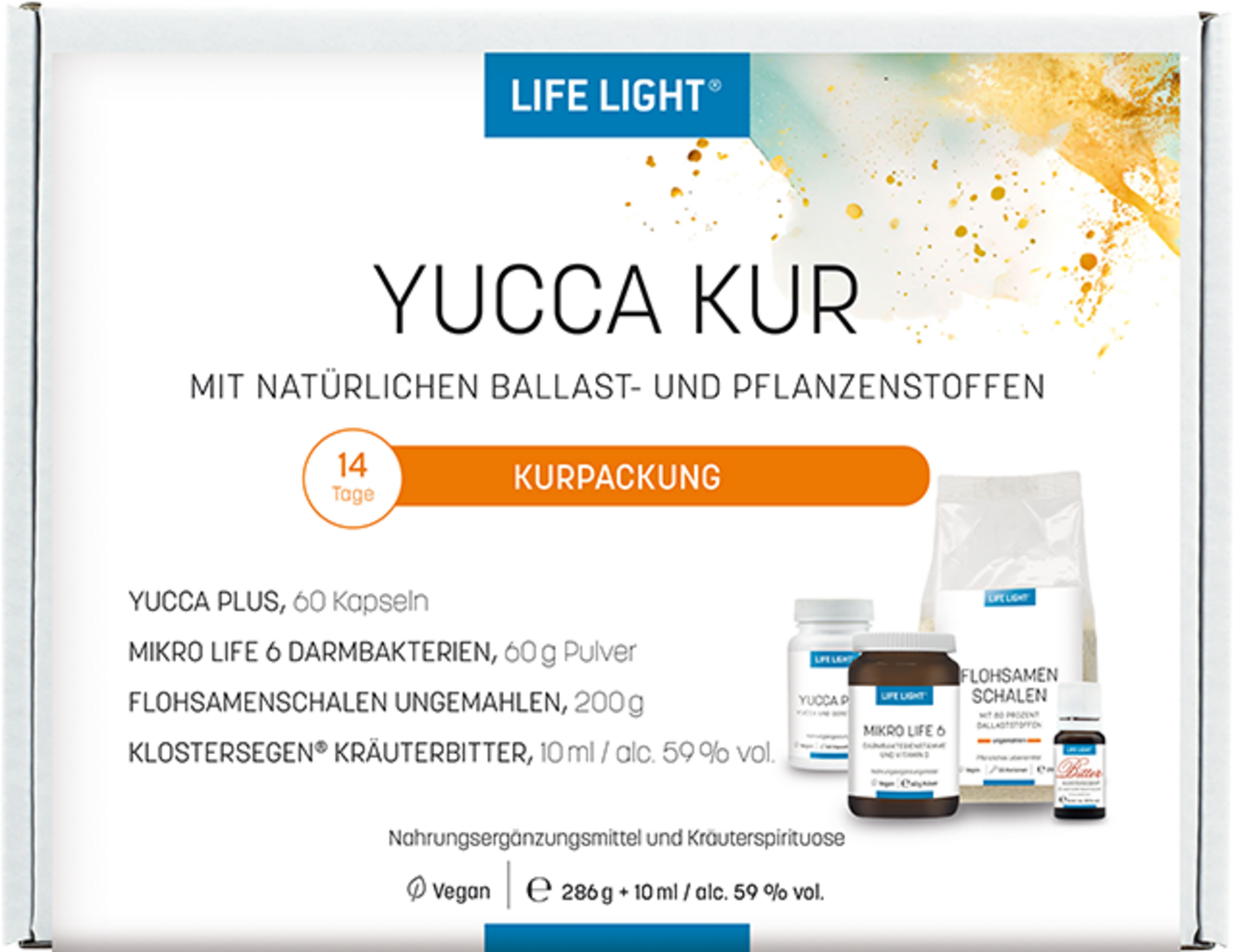50 % Yucca-Wurzel aus Wildwuchs, 50 % Gerstengraspulver getrocknet, pflanzliche Kapselhülle (Hydroxypropylmethylcellulose)