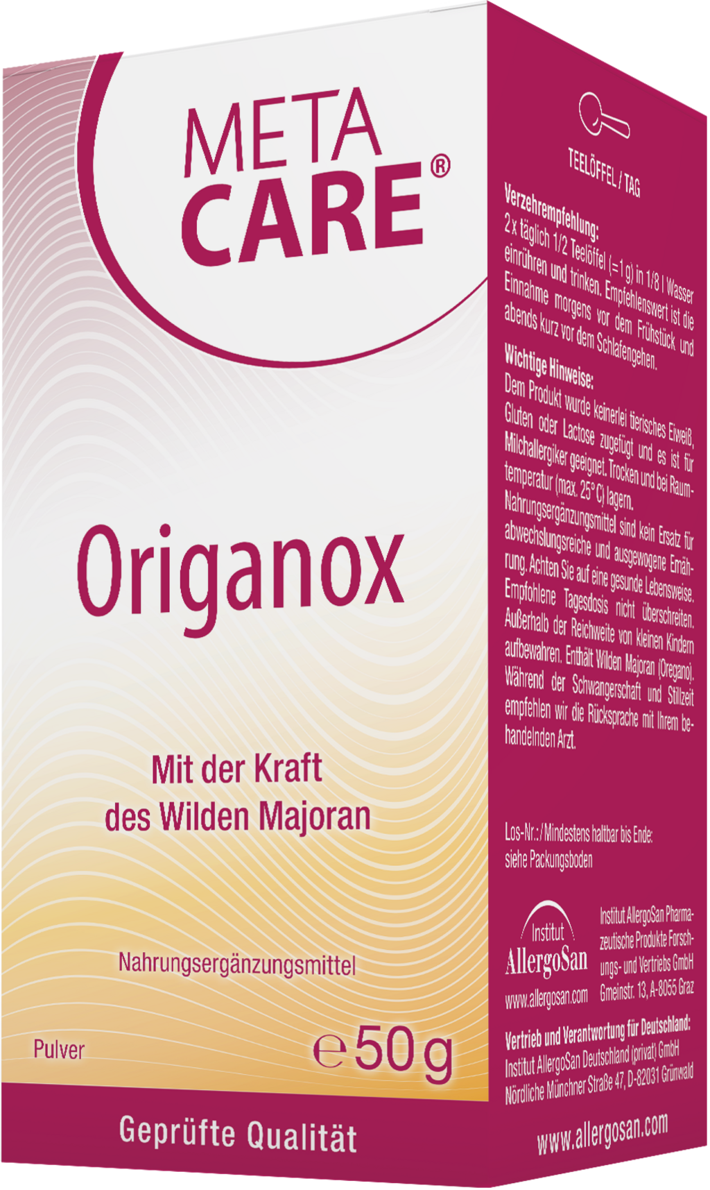 META-CARE® Origanox je visokokvalitetni prah napravljen od divljeg mažurana. Prah je 100% veganski i idealan za otapanje u tekućini i piće. META-CARE® Origanox je također bez GMO-a i kvasca.