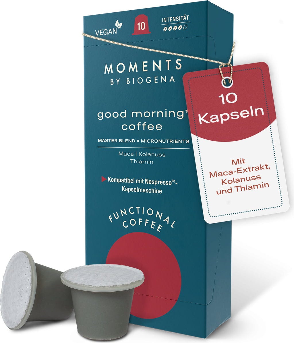 Kava good morning* coffee s ekstraktom mace, kola orahom i tiaminom podiže svakodnevni ritual ispijanja kave na novu razinu. Nepogrešiv okus kombinira promišljen sastav i posebno jednostavnu primjenu.
