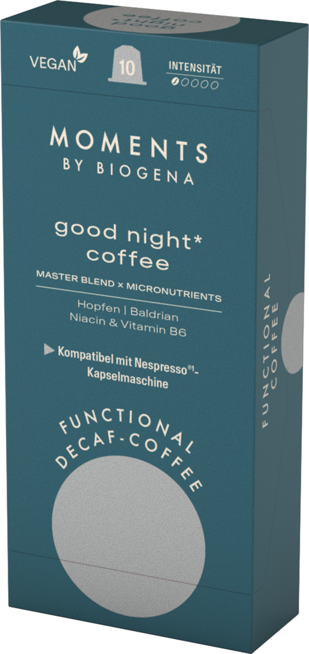 Kava good night* coffee s kavom bez kofeina, hmeljem, valerijanom, niacinom i vitaminom B6 donosi svjež polet u svakodnevni ritual ispijanja kave. Izvanredan okus ujedinjuje pažljiv sastav s posebno jednostavnim rukovanjem te je zahvaljujući svojoj formulaciji idealan za konzumaciju navečer.