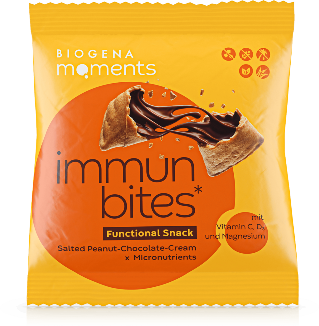 Mali zalogaji s velikim potencijalom: kompaktni poput fingerfooda, ispod hrskave ljuske skrivaju senzacionalno kremasto i neusporedivo punjenje. Okus slanog kikirikija i čokolade koja se topi u ustima pretvara svaki zalogaj u pravi užitak. Ova senzacija od snacka zaokružena je mješavinom mikronutrijenata koja između ostalog uključuje vitamin C, vitamin D i magnezij. Osim toga, immun bites osvajaju bodove svojom proizvodnjom bez dodanog šećera, bez palminog ulja i bez glutena. Sve u svemu, receptura koja je zaista impresivna.