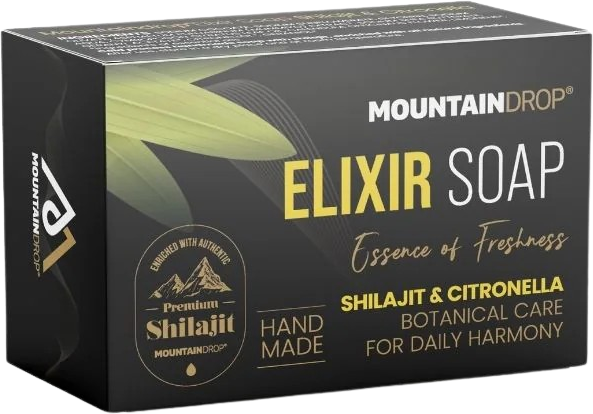 Elixir Soap brenda Mountaindrop je ekskluzivni sapun za čišćenje obogaćen vrhunskim, mineralima bogatim Shilajitom. Proizveden blagim hladnim postupkom, dragocjeni minerali i drugi sastojci osjetljivi na toplinu u potpunosti su sačuvani. Formula je posebno prilagođena potrebama različitih tipova kože i osigurava nježno čišćenje čak i osjetljive kože bez isušivanja. Sapun je dostupan u osvježavajućim okusima citronele ili mente, a koža je nahranjena nakon svakog pranja.