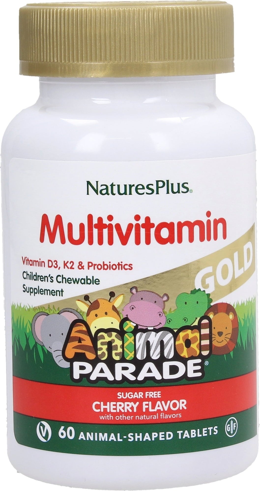 Animal Parade GOLD® je multivitamin bez šećera s odličnim okusom trešnje. Osnovna originalna Animal Parade formula proširena je sa vitaminima D3 i K2, selenom, kromom, enzimima, probiotikom i preko 20 punozrnatih koncentrata.
