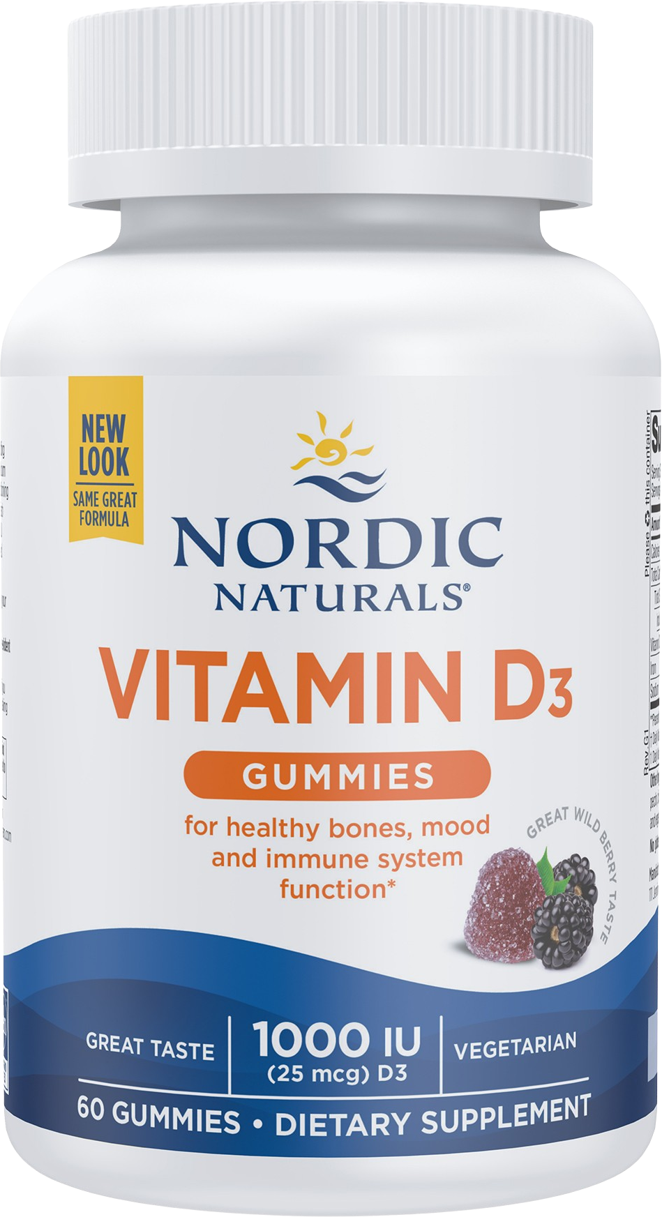 Gumirani vitamini D3 iz Nordic Naturalsa su tablete za žvakanje vitamina D3 bez želatine, ukusnog okusa šumskog voća.