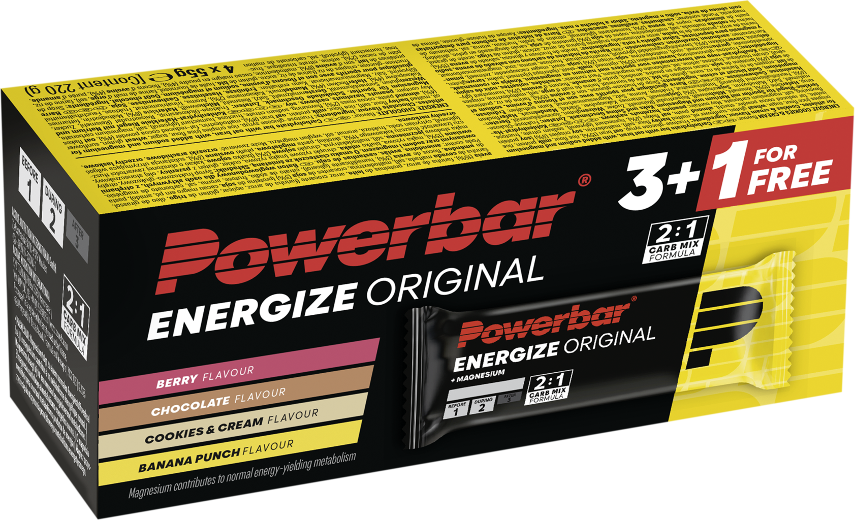 Energize Original pločica marke Powerbar sadrži visokokvalitetnu kombinaciju ugljikohidrata s optimalnim omjerom 2:1 izvora glukoze i fruktoze. Osim toga, receptu je dodana visokokvalitetna mješavina elektrolita natrija i magnezija. Bez umjetnih bojila i konzervansa, pogodna za vegetarijance, dostupna je u okusima Banana Punch, Bobičasto voće, Čokolada i Kolačići i vrhnje.
