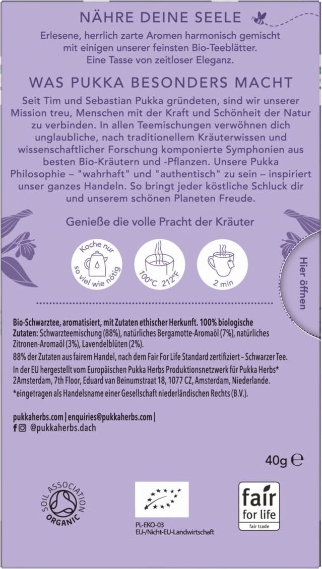Prekrasno mirisan čaj očarava već tijekom pripreme. Osnažujući crni čaj iz indijskih čajnih vrtova u kombinaciji s osvježavajućim bergamotom, nježnom lavandom i suptilnim limunom osigurava lakoću i aktivan početak dana.