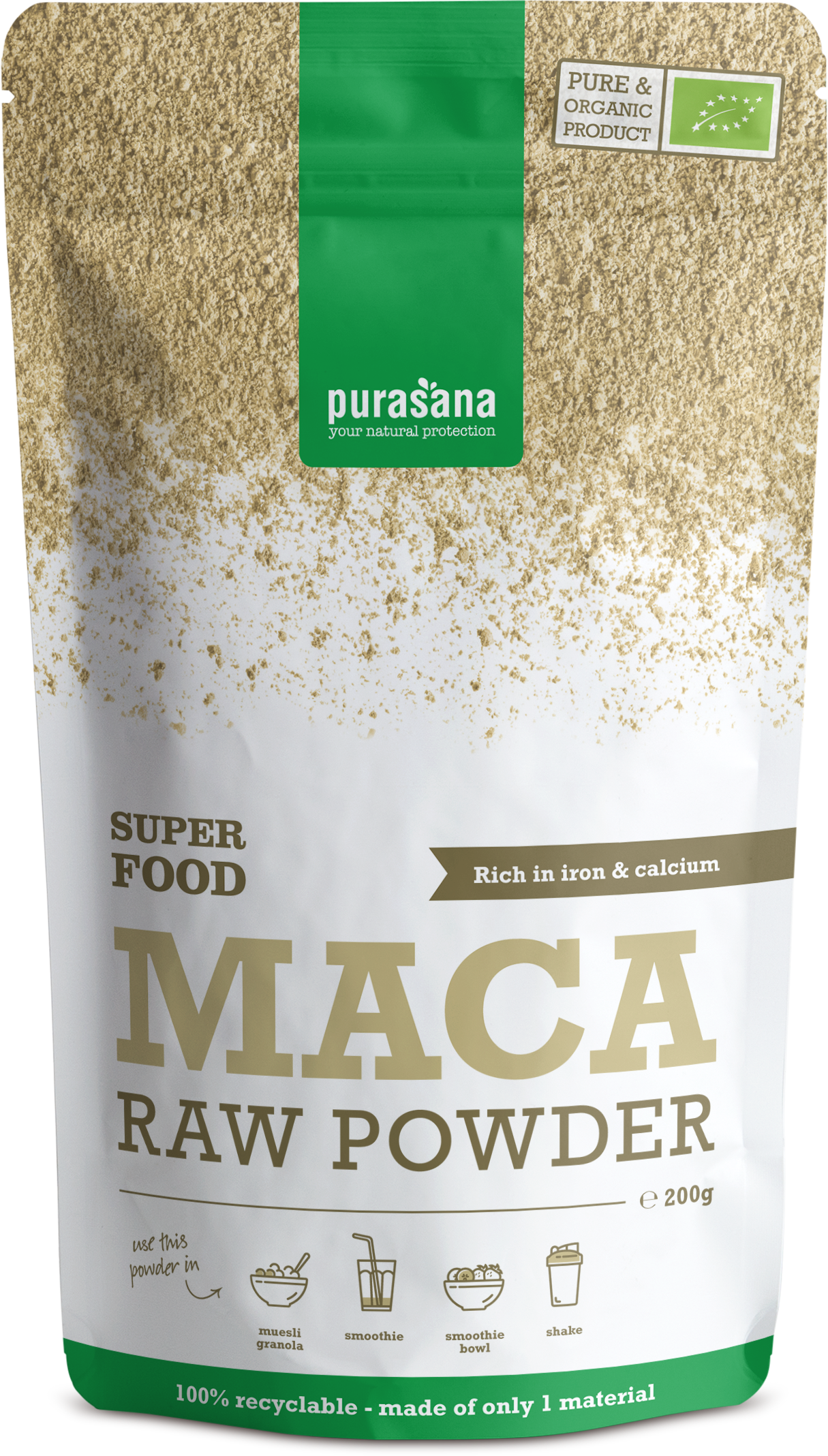 Ovaj Purasana proizvod sadrži bio korijen mace koji se suši na suncu i zatim samelje. Maca je bogata kalcijem i željezom.