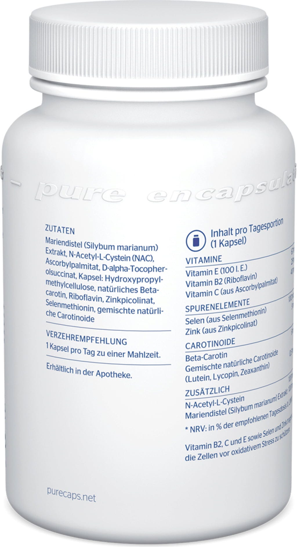 Milk Thistle (Silybum marianum) Extract, N-Acetyl-L-Cysteine (NAC), Ascorbyl Palmitate, D-alpha Tocopheryl Succinate (Vitamin E), Hydroxypropylmethylcellulose[1], Prirodni beta-karoten, Riboflavin (Vitamin B2), Zinc Picolinate, Selenomethionine, Mixed Natural Carotenoids