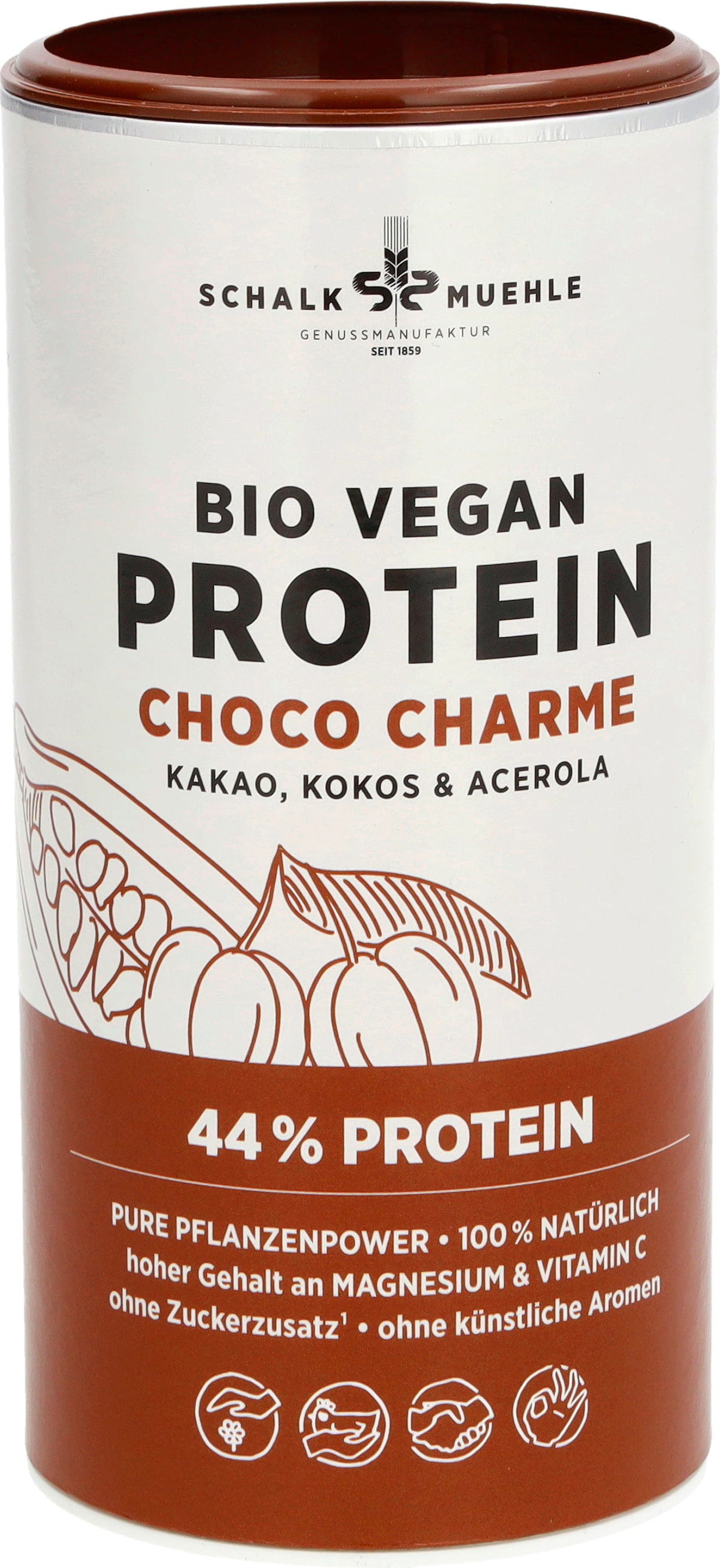 Veganski bio protein u prahu Choco Charme tvrtke Schalk Mühle ujedinjuje moćan trio! Kakao, kokos i acerola ovdje će vas oboriti s nogu. Ovaj miks donosi vam vitamin C iz acerole i visok udio magnezija. Bilo kao shake, u smoothiejima ili mueslima – Choco Charme na razne načine i potpuno bez aditiva unosi biljne bjelančevine u vaš plan prehrane.