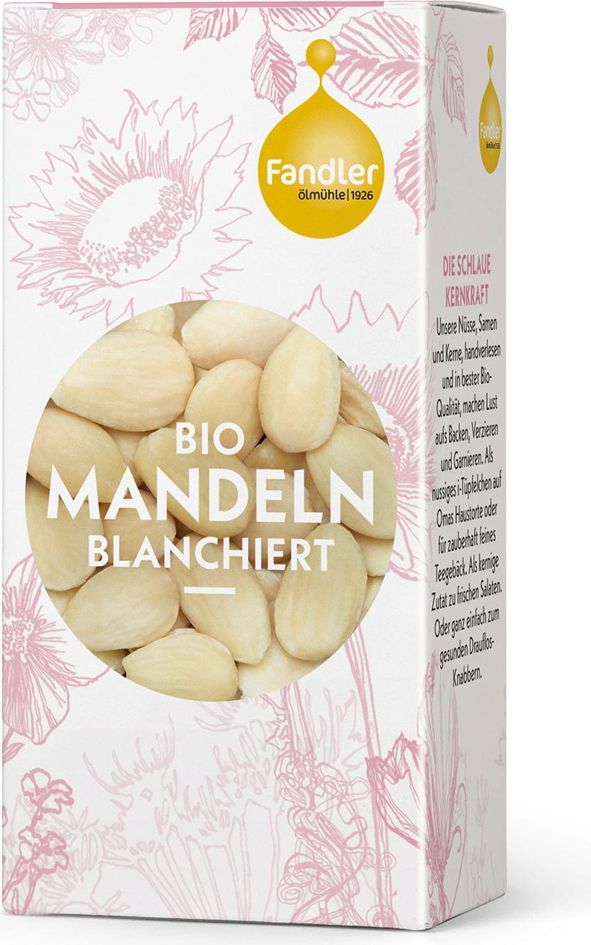 Ekološki bademi uljare Fandler izvrsni su kao mali međuobrok. Bademi sadrže puno vitamina B i E, dijetalnih vlakana, bjelančevina, kalija, magnezija i kalcija. Osim toga, svojom nježnom, pomalo slatkastom aromom jednostavno su predivnog okusa. Naravno, bademe možete koristiti i za pečenje ili za vašu domaću mješavinu mueslija.