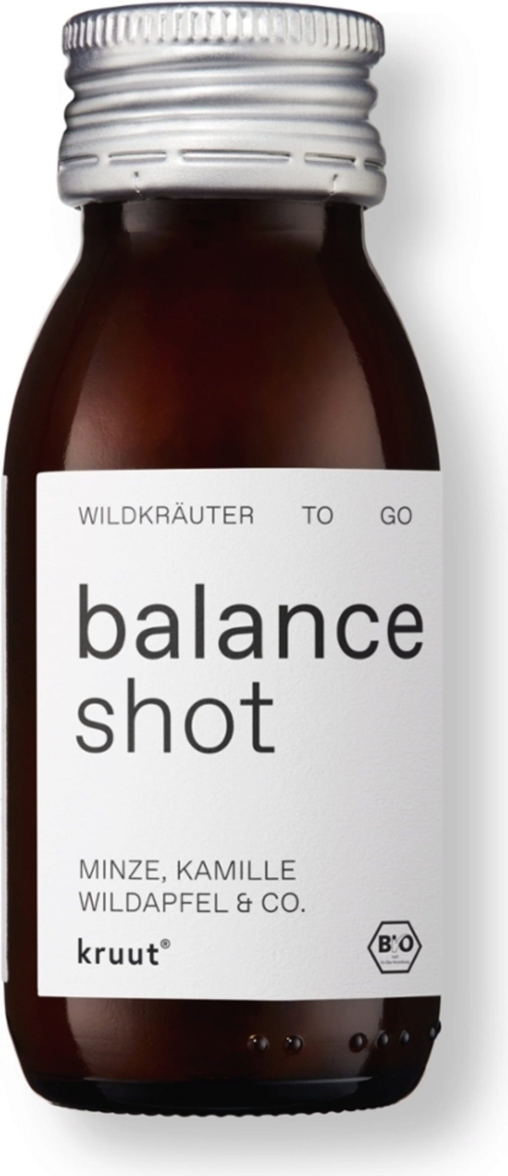 Kruut Balance Shot temelji se na provjerenoj recepturi od prirodno mutnog Demeter jabučnog octa i sirovog cvjetnog meda, obogaćenoj kiselkasto-svježim okusom regionalne divlje jabuke. Tekuća biljna mješavina sadrži ekstrakte paprene metvice, livadnog kima, kamilice i stolisnika.