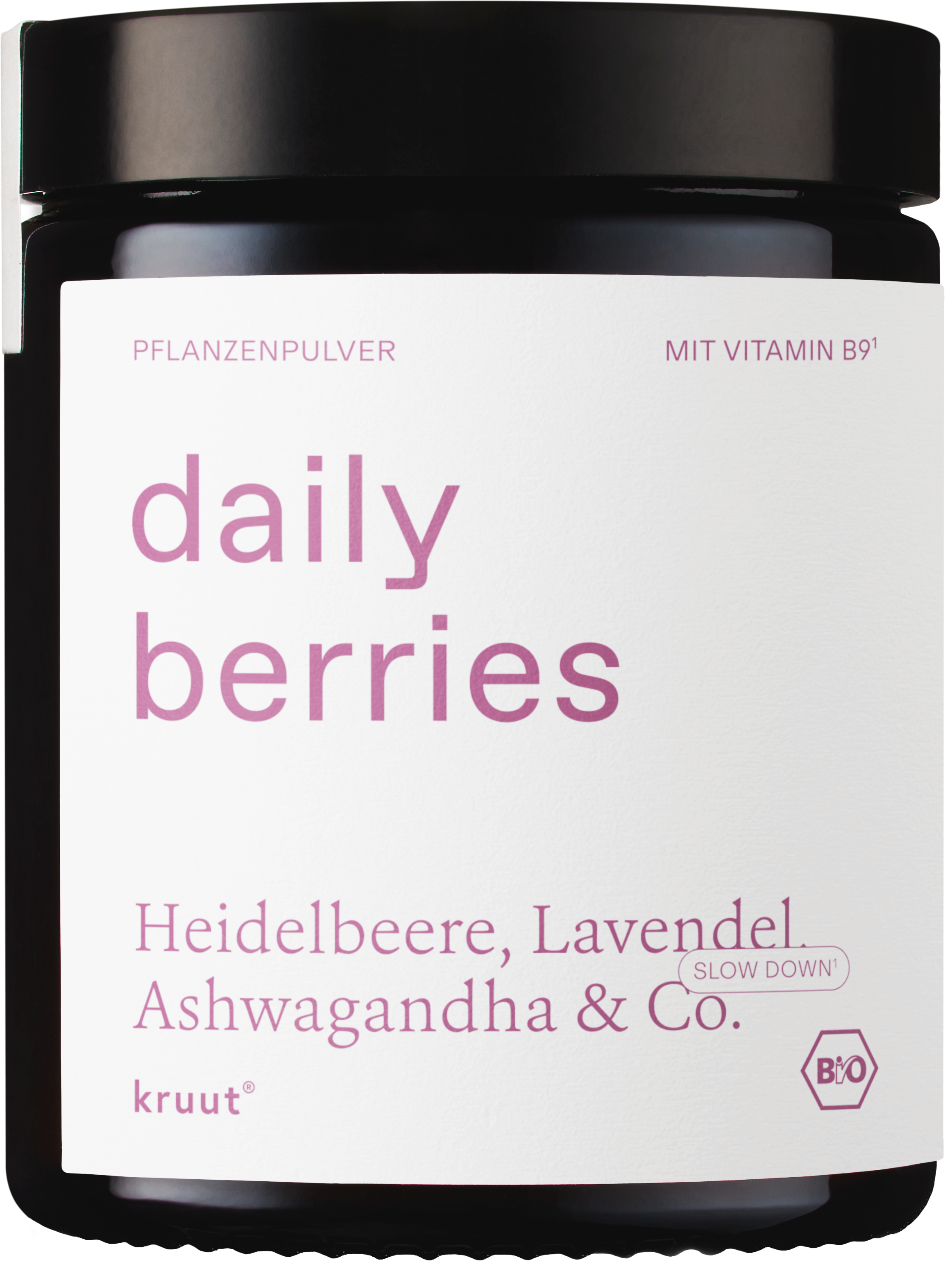 Daily Berries biljni prah marke kruut donosi Vam svjež, bobičasti užitak u Vašu kuhinju. Receptura između ostalog sadrži divlje borovnice, kupine, lavandu i ashwagandhu – ručno sakupljene na odabranim ekološkim imanjima. Nakon berbe provodi se ekstrakcija s vodom i etanolom kako bi se zaštitile osjetljive biljne tvari. Zatim se sastojci suše na niskim temperaturama kako ne bi izgubili svoju boju i dragocjene hranjive tvari. Prah se idealno uklapa u Vašu svakodnevicu i jamči raznolikost u Vašoj dnevnoj rutini.