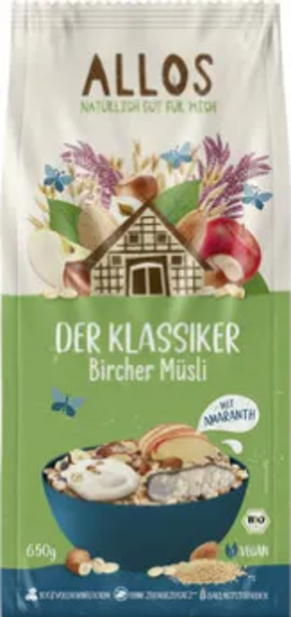 Bircher muesli pravi je klasik među muesli kreacijama. Klasična receptura ne smije nedostajati ni u širokom asortimanu tvrtke ALLOS. Najfinije integralne zobene pahuljice zaokružuju se ekspandiranim i mljevenim integralnim amarantom. Obogaćeno sušenim komadićima jabuke te prženim lješnjacima i bademima.