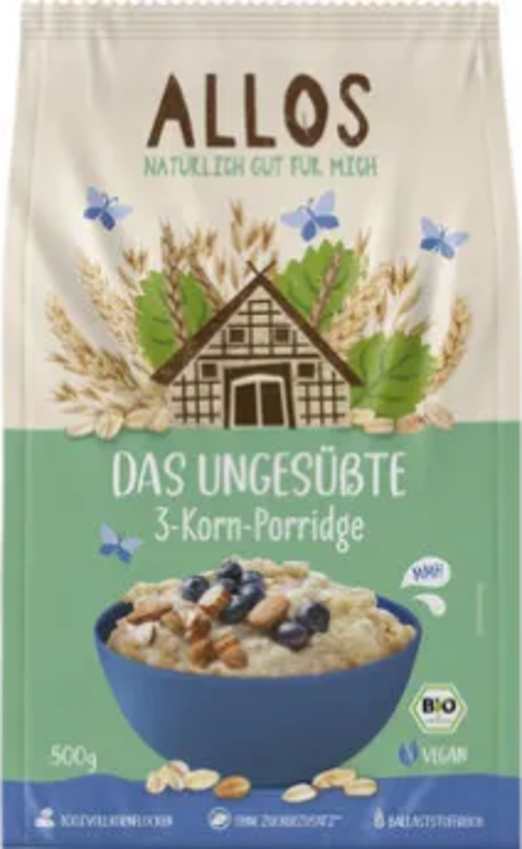 Allos Bio nezaslađena kaša od 3 vrste žitarica (Das Ungesüßte 3-Korn-Porridge), 500 g
