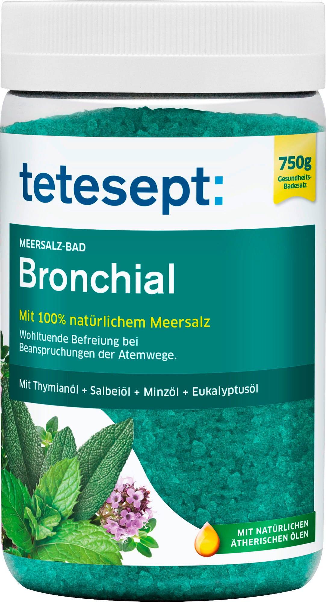 Što ima ljepše nego nakon dugog dana uživati u finoj kupki? Bronhijalna morska sol marke tetesept idealna je za hladno doba godine i oduševljava svojom formulacijom koja je 98 % prirodna. Uz najbolju morsku sol, korištena su isključivo prirodna eterična ulja majčine dušice, kadulje, metvice i eukaliptusa, koja kupku čine pravim doživljajem.