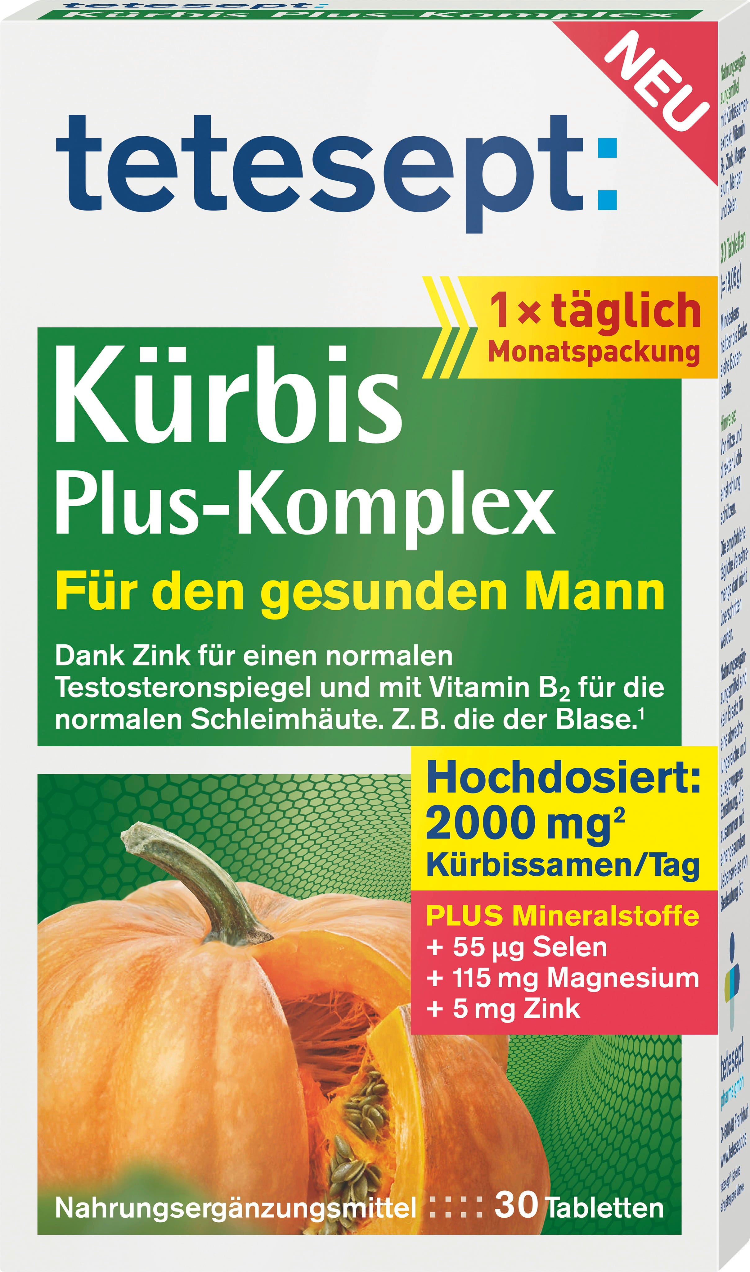 Bundeva Plus-kompleks tablete marke tetesept služe kao optimalan dodatak prehrani za muškarce. Visokodozirani ekstrakt sjemenki bundeve nadopunjen je cinkom, magnezijem i selenom. Tablete su veganske.
