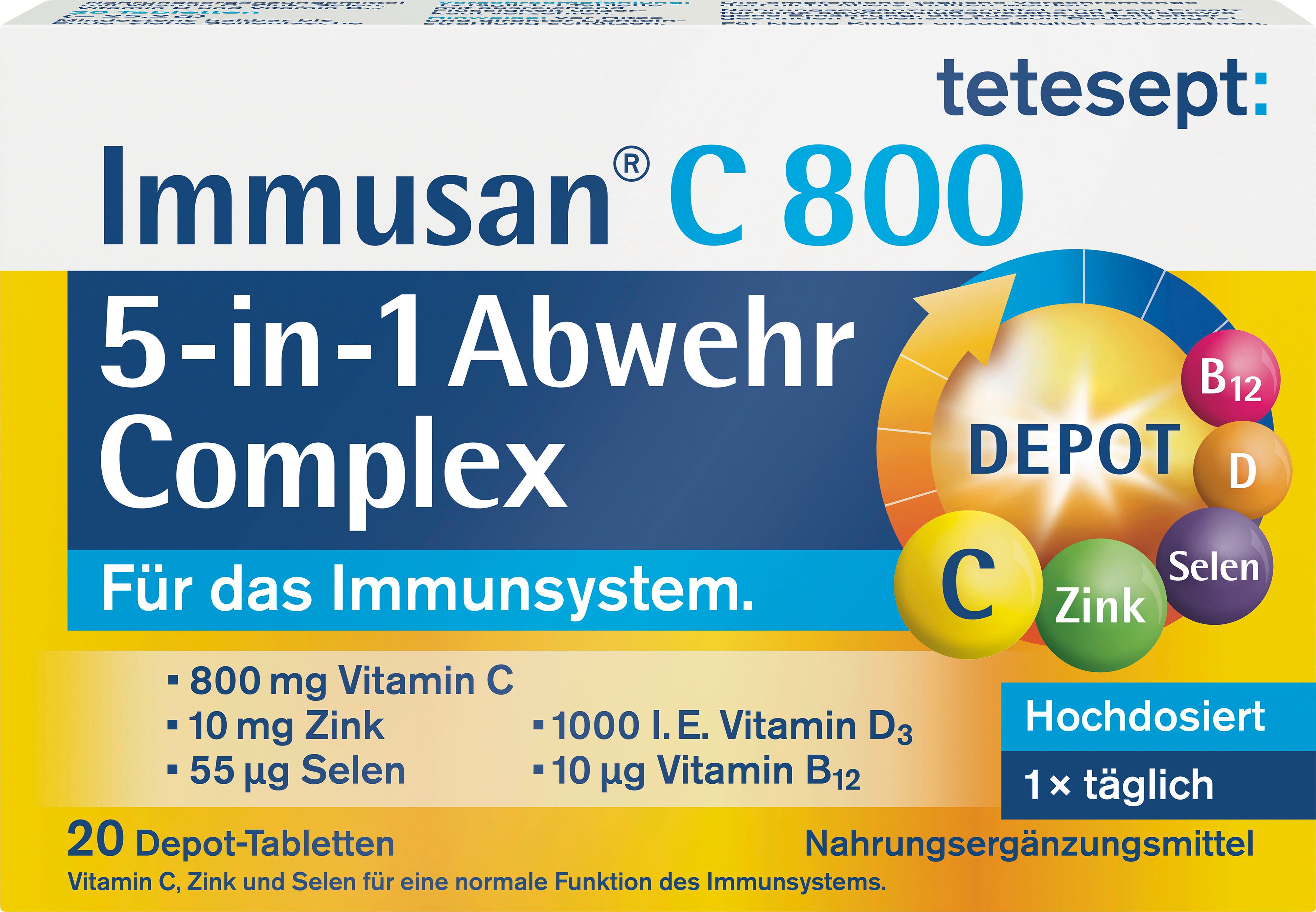 Immusan® C 800 marke tetesept je kompleks vitamina i minerala. Tablete sadrže vitamin C, D3 i B12 te cink i selen. Time vaše tijelo dobiva optimalnu podršku u zahtjevnim vremenima. Zahvaljujući depot formulaciji, otpuštanje vitamina u tijelo odvija se ravnomjerno tijekom nekoliko sati.