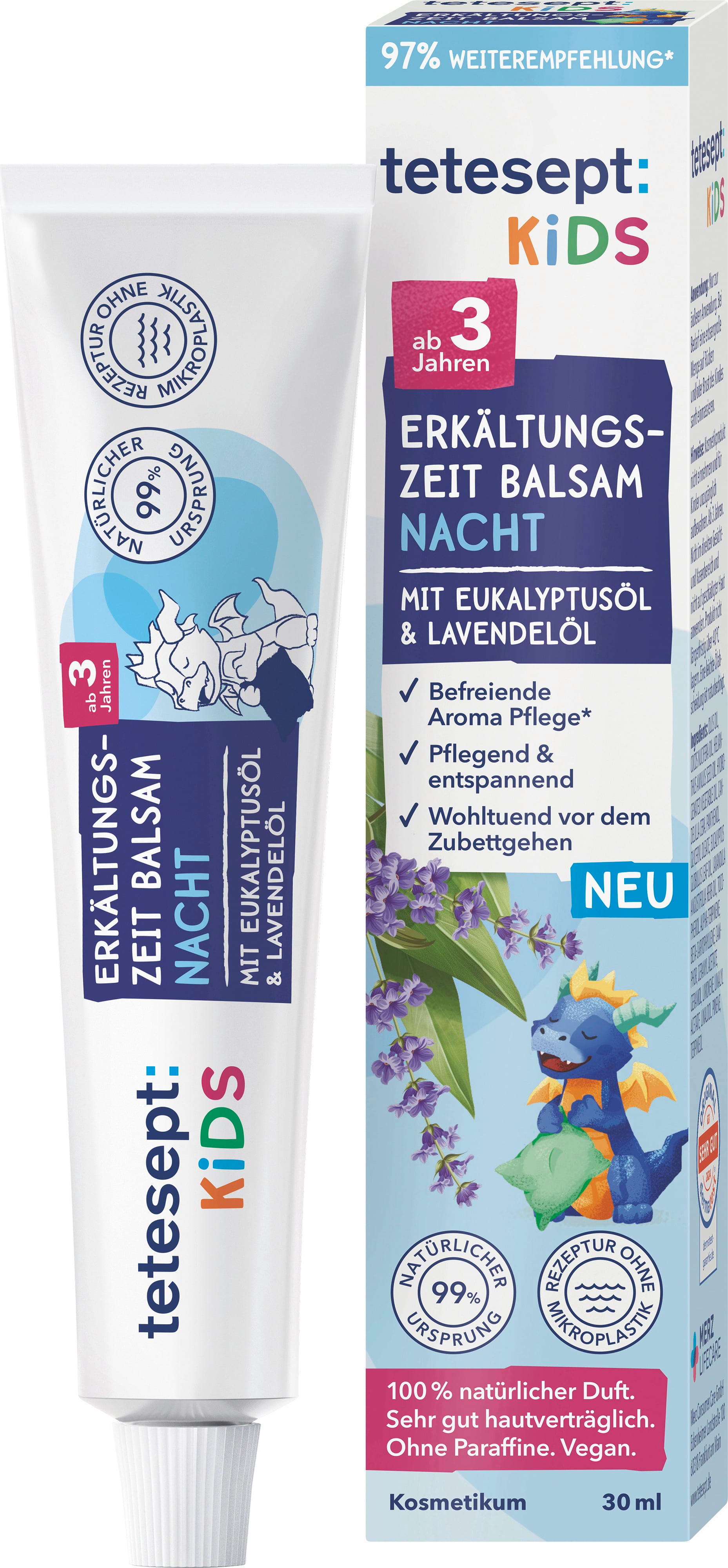 Ovaj balzam marke tetesept idealan je za trljanje prsa i leđa prije spavanja. Nježna receptura mazi prirodnim mirisom ulja eukaliptusa i lavande. Balzam je veganski te bez parafina i mikroplastike. Prikladno za djecu od 3 godine.