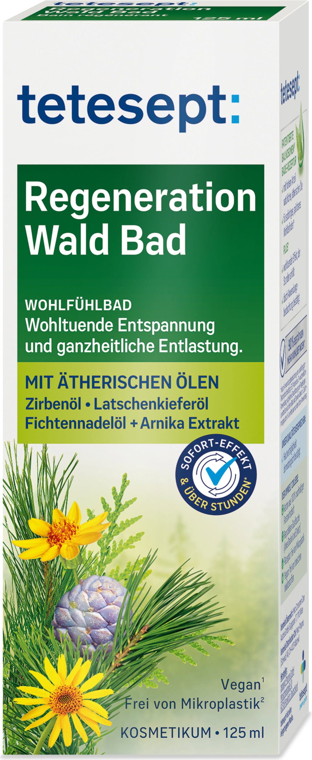 Kupka za regeneraciju Šuma marke tetesept miriše kao šetnja šumom. Prirodna eterična ulja smrekovih iglica, planinskog bora i cedrovine nadopunjena su ekstraktom arnike i stvaraju predivan miris. Koncentrat za kupku je veganski te bez PEG-ova i predivno je prikladan za večernju punu kupku.