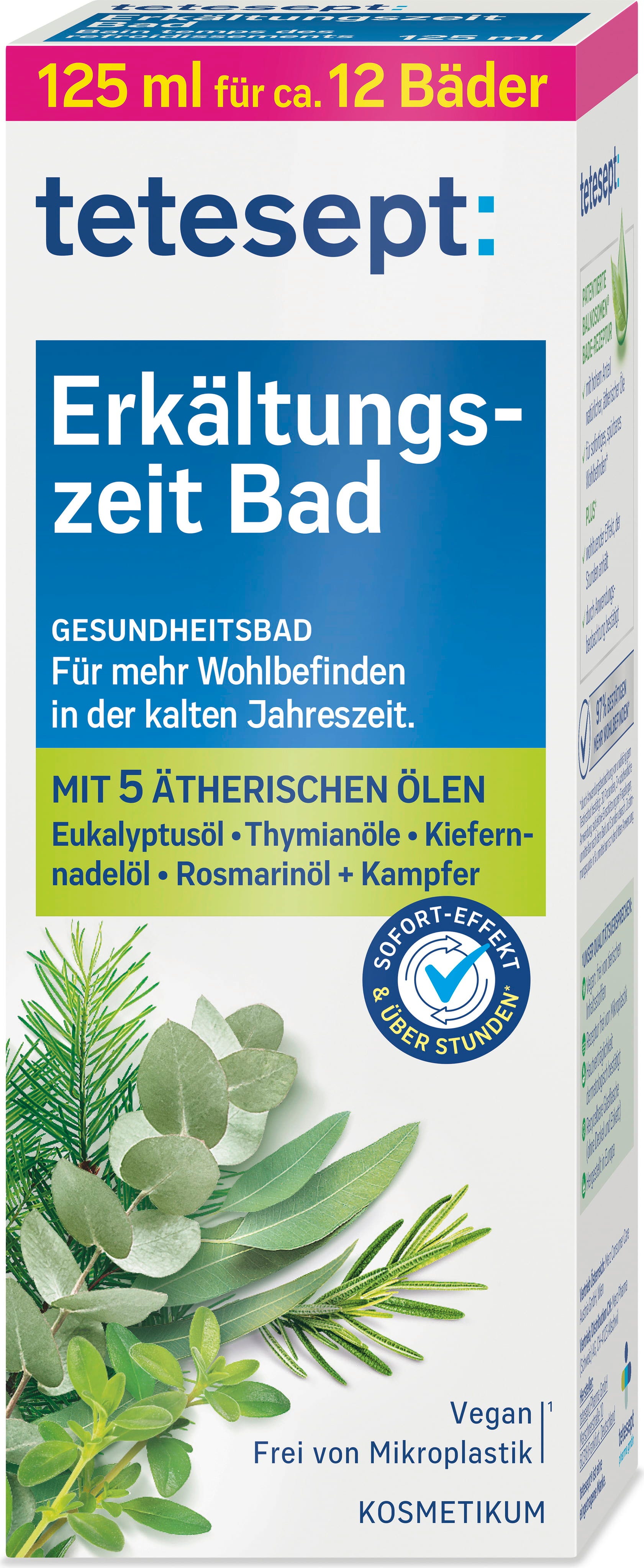 Upravo u vlažno i hladno doba godine predivno je nakon dugog dana nagraditi se finom, toplom kupkom! Kupka za vrijeme prehlade marke tetesept savršen je izbor za to. Njezina veganska formulacija bez PEG-ova ima svojstva koja njeguju kožu i sadrži isključivo prirodna eterična ulja eukaliptusa, borovih iglica, majčine dušice i ružmarina.