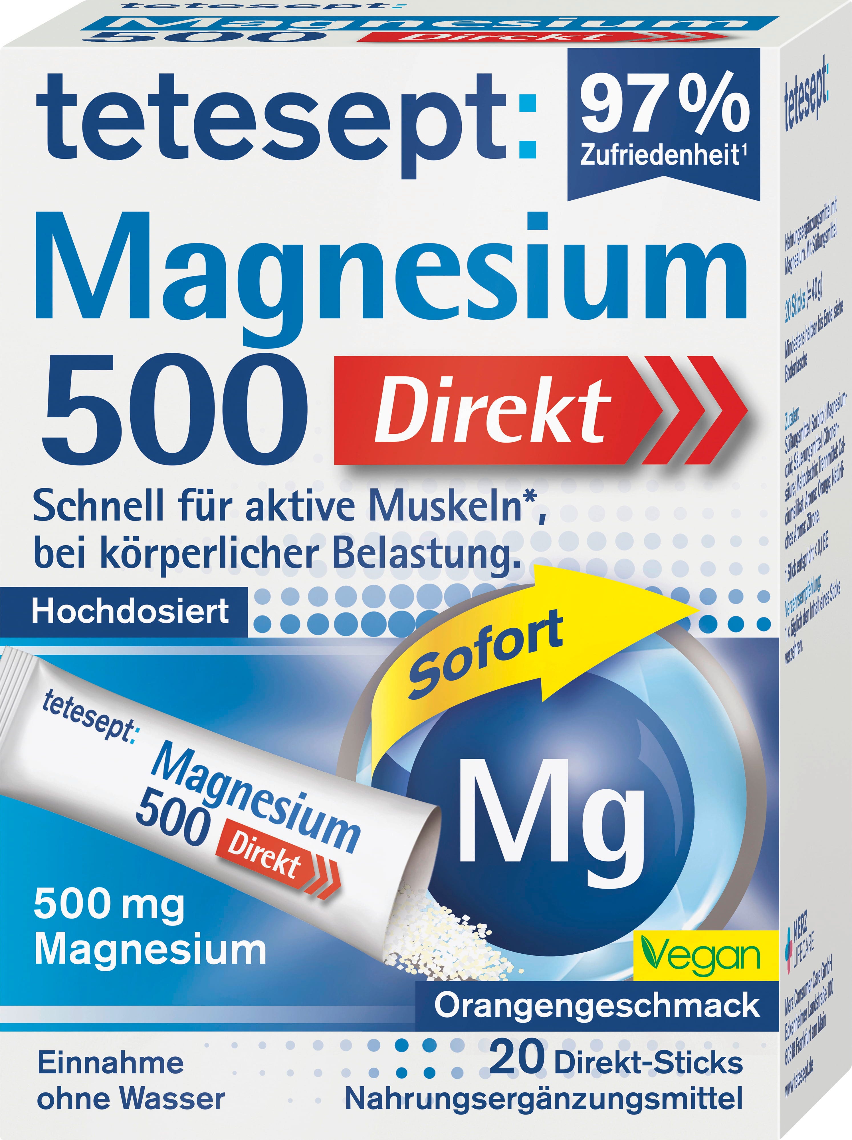 Magnezij 500 Direkt vrećice marke tetesept prikladne su za brzo i izravno uzimanje magnezija. Zahvaljujući voćnom okusu naranče uzimanje je posebno ugodno. Receptura je veganska.