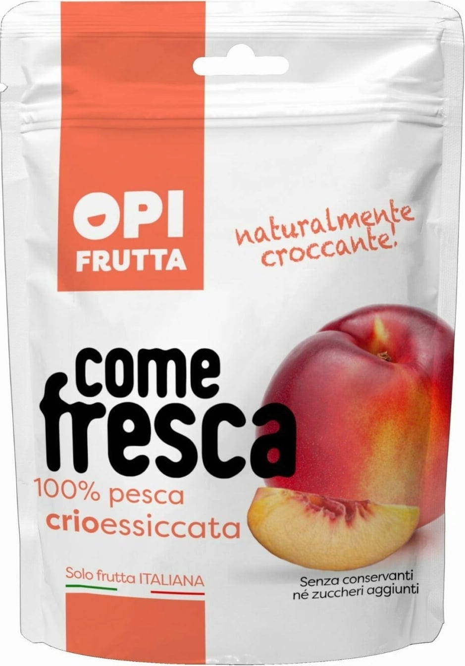 Slatke, sočne i pune sunčanih aroma: liofilizirane kriške breskve brenda OPI FRUTTA donose ljeto u kutiju s međuobrocima – potpuno bez aditiva. Nježna obrada čuva dragocjene vitamine i minerale.